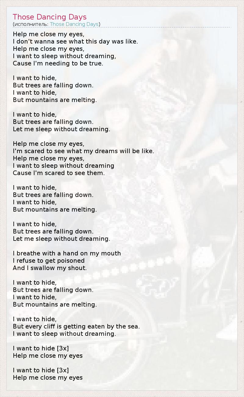 Помоги мне закрыть глаза, Я не хочу видеть, на что был похож этот день. Помоги мне закрыть глаза, Я хочу спать, не видя снов, Ведь мне нужно, чтобы они были правдой. Я хочу спрятаться, Но деревья падают, Я хочу спрятаться, Но горы тают, Я хочу спрятаться, Но деревья падают, Позволь мне уснуть, не видя снов. Помоги мне закрыть глаза, Я боюсь увидеть, какими будут мои сны. Помоги мне закрыть глаза. Я хочу спать, не видя снов, Потому что я боюсь их увидеть. Я хочу спрятаться, Но деревья падают, Я хочу спрятаться, Но горы тают, Я хочу спрятаться, Но деревья падают, Позволь мне уснуть, не видя снов. Я вздыхаю, приложив ладонь ко рту, Я отказываюсь быть опьяненной, И я подавляю свой крик. Я хочу спрятаться, Но деревья падают, Я хочу спрятаться, Но горы тают, Я хочу спрятаться, Но каждый утёс поглощается морем. Я хочу спать, не видя снов. Я хочу спрятаться, [3x] Помоги мне закрыть глаза... Я хочу спрятаться, [3x] Помоги мне закрыть глаза..