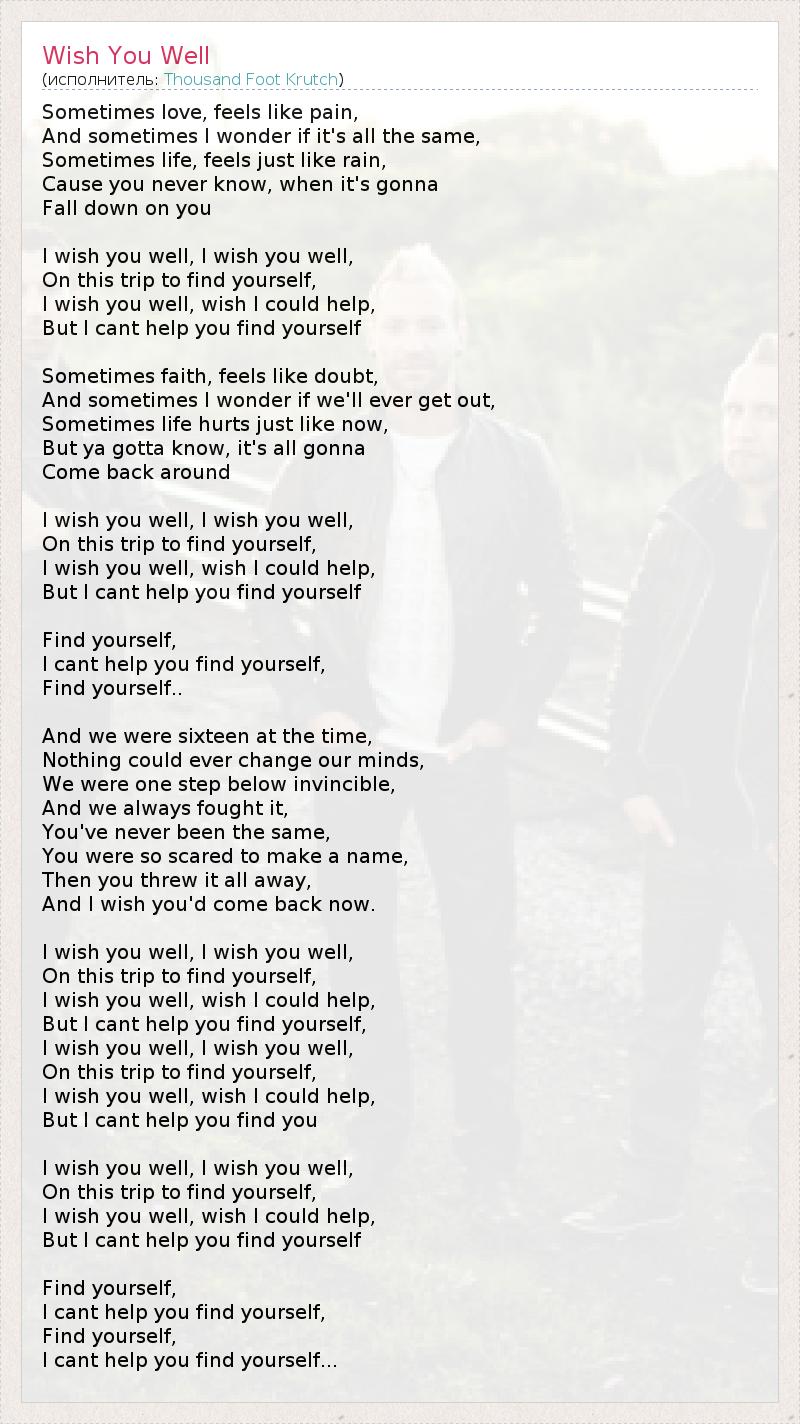 Sometimes love, feels like pain, And sometimes I wonder if it's all the same, Sometimes life, feels just like rain, Cause you never know, when it's gonna Fall down on you I wish you well, I wish you well, On this trip to find yourself, I wish you well, wish I could help, But I cant help you find yourself Sometimes faith, feels like doubt, And sometimes I wonder if we'll ever get out, Sometimes life hurts just like now, But ya gotta know, it's all gonna Come back around I wish you well, I wish you well, On this trip to find yourself, I wish you well, wish I could help, But I cant help you find yourself Find yourself, I cant help you find yourself, Find yourself.. And we were sixteen at the time, Nothing could ever change our minds, We were one step below invincible, And we always fought it, You've never been the same, You were so scared to make a name, Then you threw it all away, And I wish you'd come back now. I wish you well, I wish you well, On this trip to find yourself, I wish you well, wish I could help, But I cant help you find yourself, I wish you well, I wish you well, On this trip to find yourself, I wish you well, wish I could help, But I cant help you find you I wish you well, I wish you well, On this trip to find yourself, I wish you well, wish I could help, But I cant help you find yourself Find yourself, I cant help you find yourself, Find yourself, I cant help you find yourself...