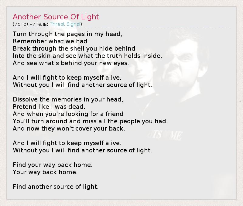 Переворачивай страницы в моей голове, Вспоминай о том, что у нас было. Пробивайся сквозь оболочку, что ты прячешь за спиной, Под кожу и смотри на то, что скрывает внутри правда. И смотри на то, что скрывается за твоим новым взглядом. И я буду бороться, чтобы остаться в живых, Без тебя я найду другой источник света. Раствори воспоминания в своей голове, Притворись, что я мёртв. И когда тебе нужен будет друг, Ты посмотришь на всё по-другому и будешь скучать по людям, Которые были рядом с тобой. Теперь они уже не прикроют тебя. И я буду бороться, чтобы остаться в живых, Без тебя я найду другой источник света. Найди свою дорогу обратно домой. Свою дорогу обратно домой. Найди другой источник света.
