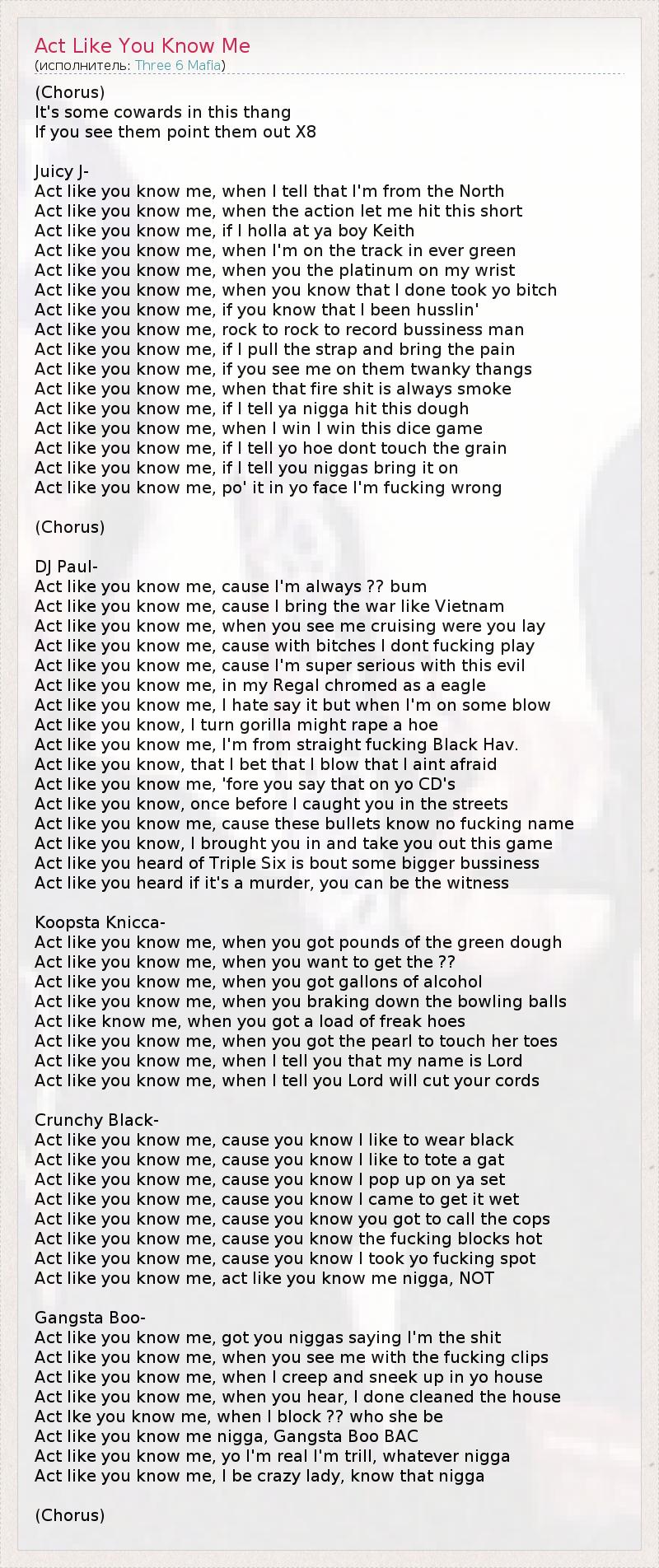 (Chorus) It's some cowards in this thang If you see them point them out X8 Juicy J- Act like you know me, when I tell that I'm from the North Act like you know me, when the action let me hit this short Act like you know me, if I holla at ya boy Keith Act like you know me, when I'm on the track in ever green Act like you know me, when you the platinum on my wrist Act like you know me, when you know that I done took yo bitch Act like you know me, if you know that I been husslin' Act like you know me, rock to rock to record bussiness man Act like you know me, if I pull the strap and bring the pain Act like you know me, if you see me on them twanky thangs Act like you know me, when that fire shit is always smoke Act like you know me, if I tell ya nigga hit this dough Act like you know me, when I win I win this dice game Act like you know me, if I tell yo hoe dont touch the grain Act like you know me, if I tell you niggas bring it on Act like you know me, po' it in yo face I'm fucking wrong (Chorus) DJ Paul- Act like you know me, cause I'm always ?? bum Act like you know me, cause I bring the war like Vietnam Act like you know me, when you see me cruising were you lay Act like you know me, cause with bitches I dont fucking play Act like you know me, cause I'm super serious with this evil Act like you know me, in my Regal chromed as a eagle Act like you know me, I hate say it but when I'm on some blow Act like you know, I turn gorilla might rape a hoe Act like you know me, I'm from straight fucking Black Hav. Act like you know, that I bet that I blow that I aint afraid Act like you know me, 'fore you say that on yo CD's Act like you know, once before I caught you in the streets Act like you know me, cause these bullets know no fucking name Act like you know, I brought you in and take you out this game Act like you heard of Triple Six is bout some bigger bussiness Act like you heard if it's a murder, you can be the witness Koopsta Knicca- Act like you know me, when you got pounds of the green dough Act like you know me, when you want to get the ?? Act like you know me, when you got gallons of alcohol Act like you know me, when you braking down the bowling balls Act like know me, when you got a load of freak hoes Act like you know me, when you got the pearl to touch her toes Act like you know me, when I tell you that my name is Lord Act like you know me, when I tell you Lord will cut your cords Crunchy Black- Act like you know me, cause you know I like to wear black Act like you know me, cause you know I like to tote a gat Act like you know me, cause you know I pop up on ya set Act like you know me, cause you know I came to get it wet Act like you know me, cause you know you got to call the cops Act like you know me, cause you know the fucking blocks hot Act like you know me, cause you know I took yo fucking spot Act like you know me, act like you know me nigga, NOT Gangsta Boo- Act like you know me, got you niggas saying I'm the shit Act like you know me, when you see me with the fucking clips Act like you know me, when I creep and sneek up in yo house Act like you know me, when you hear, I done cleaned the house Act lke you know me, when I block ?? who she be Act like you know me nigga, Gangsta Boo BAC Act like you know me, yo I'm real I'm trill, whatever nigga Act like you know me, I be crazy lady, know that nigga (Chorus)