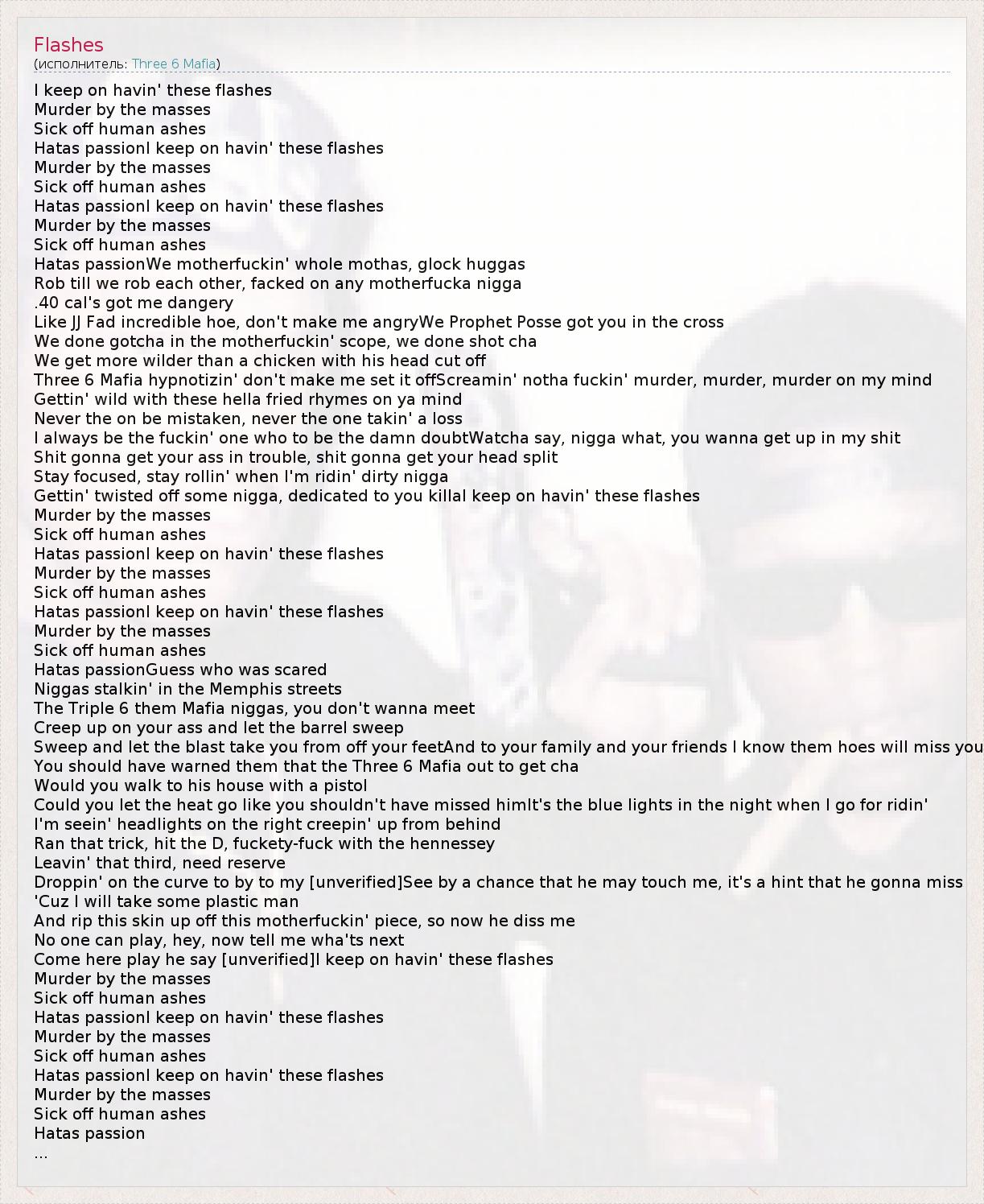 Это интересно:Three 6 Mafia - рэп группа с юга. Они быстро выросли из скромного подпольного рэп коллектива в коммерчески успешную династию, сохранив свои первоначальные качества и выпустив множество альбомов. Представляющие город Мемфис, шесть основных членов группы (Crunchy Black, Gangsta Boo, Lord Infamous, Koopsta Knicca, Juicy "J" и DJ Paul) своими текстами о наркотиках, агрессии, сексе и других нехороших вещах придали ей мрачный... продолжение