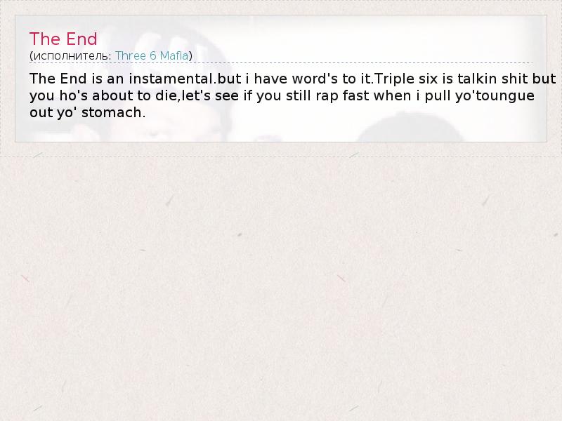 The End is an instamental.but i have word's to it.Triple six is talkin shit but