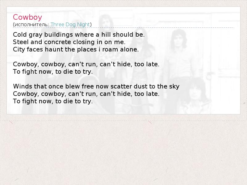 Это интересно:Three Dog Night - американская рок-группа, находившаяся на пике популярности с 1968 по 1975 год. Изначально в группе было три вокалиста - Денни Хаттон (Danny Hutton), Чак Негрон (Chuck Negron) и Кори Уэллс (Cory Wells). Начав свою музыкальную карьеру с продюсером Beach Boys Брайаном Уилсоном (Brian Wilson), они выступали под именем Redwood, но вскоре сменили название на Three Dog Night, став одной из наиболее успешных групп конца 1960-х - начала... продолжение
