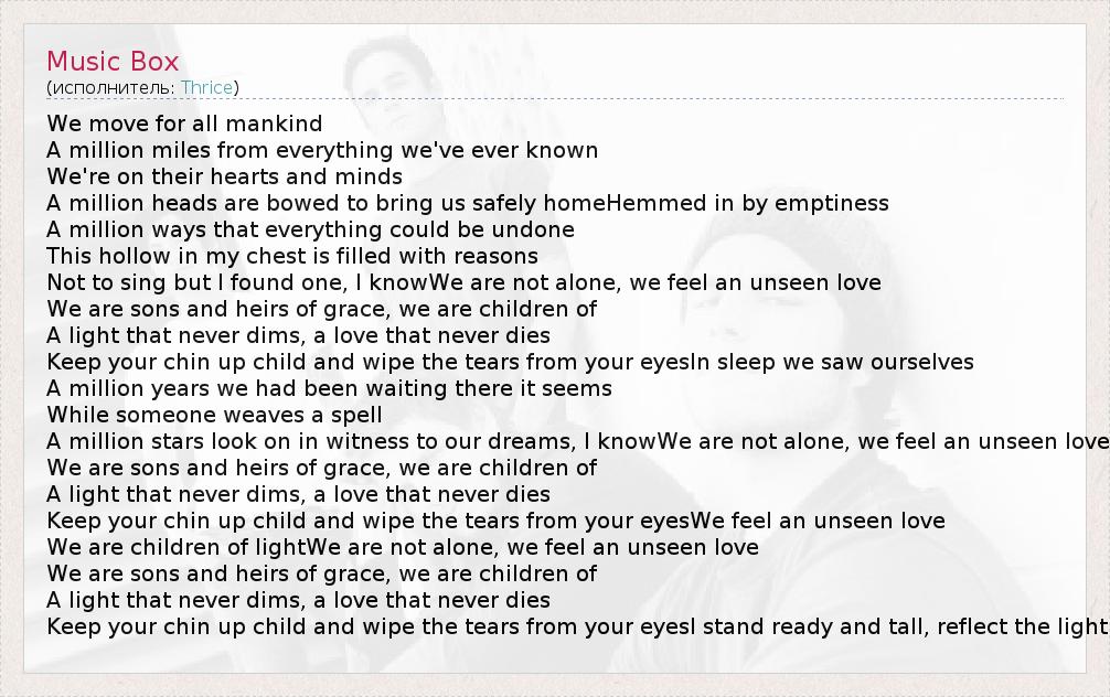 Это интересно:Thrice - это американская post-hardcore / melodic hardcore (раннее творчество) группа из города Ирвин, штат Калифорния, сформированная в 1998 году. Группа была основана гитаристом/вокалистом Дастином Кенсру и гитаристом Теппеем Тераниши, в то время, когда они обучались в средней школе. Группа известна быстрой, мощной музыкой, выражающейся в тяжелых... продолжение