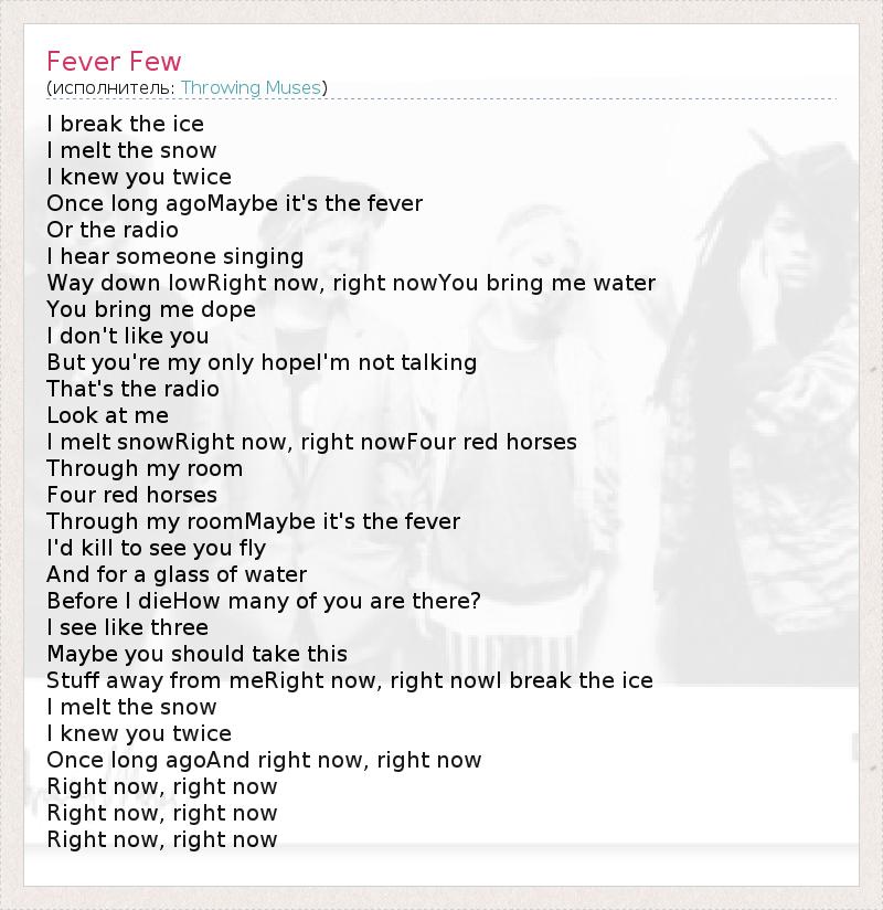 I break the ice I melt the snow I knew you twice Once long agoMaybe it's the fever Or the radio I hear someone singing Way down lowRight now, right nowYou bring me water You bring me dope I don't like you But you're my only hopeI'm not talking That's the radio Look at me I melt snowRight now, right nowFour red horses Through my room Four red horses Through my roomMaybe it's the fever I'd kill to see you fly And for a glass of water Before I dieHow many of you are there? I see like three Maybe you should take this Stuff away from meRight now, right nowI break the ice I melt the snow I knew you twice Once long agoAnd right now, right now Right now, right now Right now, right now Right now, right now
