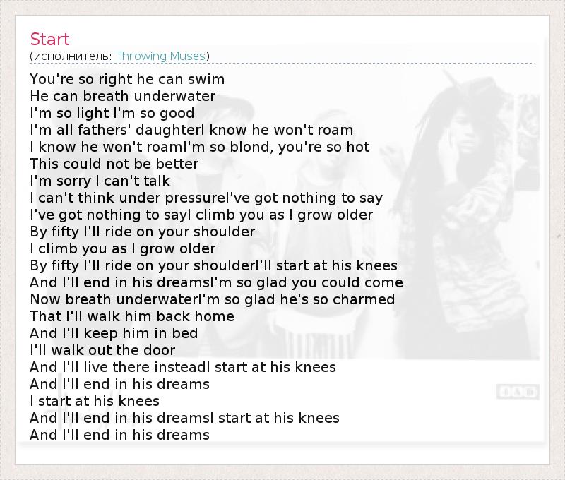 You're so right he can swim He can breath underwater I'm so light I'm so good I'm all fathers' daughterI know he won't roam I know he won't roamI'm so blond, you're so hot This could not be better I'm sorry I can't talk I can't think under pressureI've got nothing to say I've got nothing to sayI climb you as I grow older By fifty I'll ride on your shoulder I climb you as I grow older By fifty I'll ride on your shoulderI'll start at his knees And I'll end in his dreamsI'm so glad you could come Now breath underwaterI'm so glad he's so charmed That I'll walk him back home And I'll keep him in bed I'll walk out the door And I'll live there insteadI start at his knees And I'll end in his dreams I start at his knees And I'll end in his dreamsI start at his knees And I'll end in his dreams