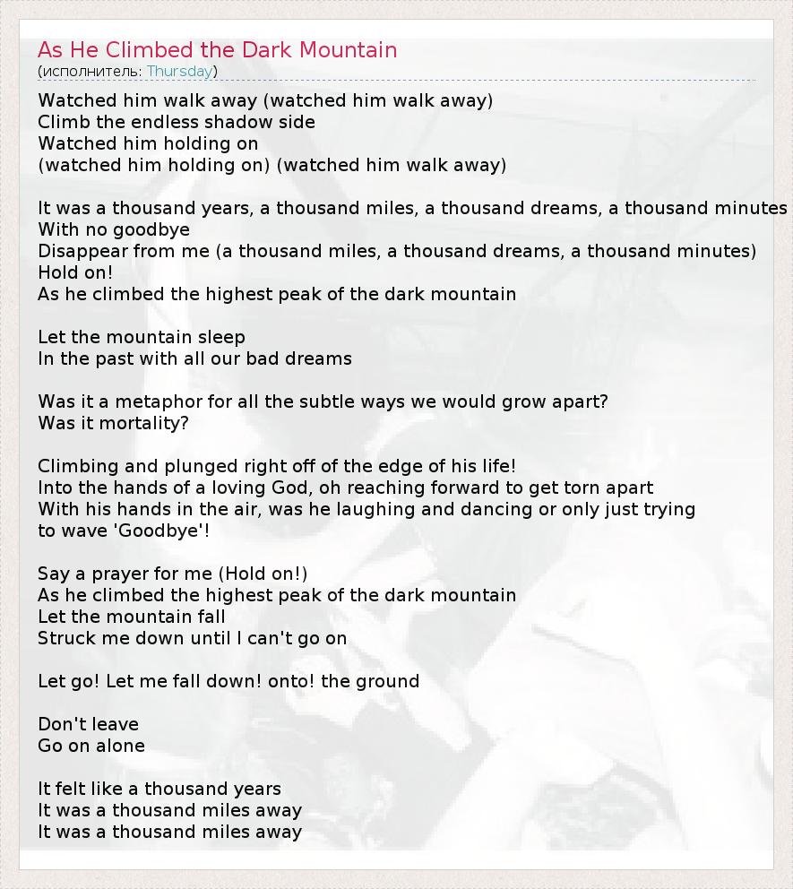 Watched him walk away (watched him walk away) Climb the endless shadow side Watched him holding on (watched him holding on) (watched him walk away) It was a thousand years, a thousand miles, a thousand dreams, a thousand minutes With no goodbye Disappear from me (a thousand miles, a thousand dreams, a thousand minutes) Hold on! As he climbed the highest peak of the dark mountain Let the mountain sleep In the past with all our bad dreams Was it a metaphor for all the subtle ways we would grow apart? Was it mortality? Climbing and plunged right off of the edge of his life! Into the hands of a loving God, oh reaching forward to get torn apart With his hands in the air, was he laughing and dancing or only just trying to wave 'Goodbye'! Say a prayer for me (Hold on!) As he climbed the highest peak of the dark mountain Let the mountain fall Struck me down until I can't go on Let go! Let me fall down! onto! the ground Don't leave Go on alone It felt like a thousand years It was a thousand miles away It was a thousand miles away