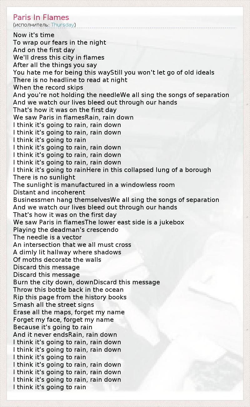 Now it's time To wrap our fears in the night And on the first day We'll dress this city in flames After all the things you say You hate me for being this wayStill you won't let go of old ideals There is no headline to read at night When the record skips And you're not holding the needleWe all sing the songs of separation And we watch our lives bleed out through our hands That's how it was on the first day We saw Paris in flamesRain, rain down I think it's going to rain, rain down I think it's going to rain, rain down I think it's going to rain I think it's going to rain, rain down I think it's going to rain, rain down I think it's going to rain, rain down I think it's going to rainHere in this collapsed lung of a borough There is no sunlight The sunlight is manufactured in a windowless room Distant and incoherent Businessmen hang themselvesWe all sing the songs of separation And we watch our lives bleed out through our hands That's how it was on the first day We saw Paris in flamesThe lower east side is a jukebox Playing the deadman's crescendo The needle is a vector An intersection that we all must cross A dimly lit hallway where shadows Of moths decorate the walls Discard this message Discard this message Burn the city down, downDiscard this message Throw this bottle back in the ocean Rip this page from the history books Smash all the street signs Erase all the maps, forget my name Forget my face, forget my name Because it's going to rain And it never endsRain, rain down I think it's going to rain, rain down I think it's going to rain, rain down I think it's going to rain I think it's going to rain, rain down I think it's going to rain, rain down I think it's going to rain, rain down I think it's going to rain