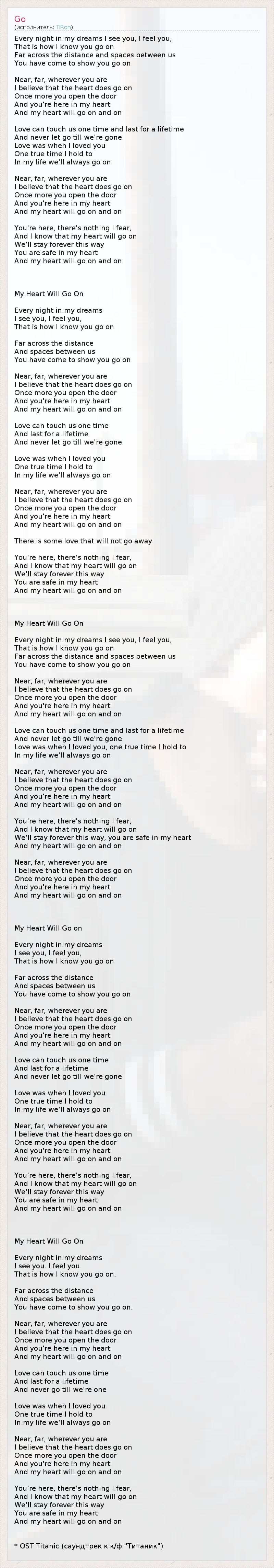 Every night in my dreams I see you, I feel you, That is how I know you go on Far across the distance and spaces between us You have come to show you go on Near, far, wherever you are I believe that the heart does go on Once more you open the door And you're here in my heart And my heart will go on and on Love can touch us one time and last for a lifetime And never let go till we're gone Love was when I loved you One true time I hold to In my life we'll always go on Near, far, wherever you are I believe that the heart does go on Once more you open the door And you're here in my heart And my heart will go on and on You're here, there's nothing I fear, And I know that my heart will go on We'll stay forever this way You are safe in my heart And my heart will go on and on My Heart Will Go On Every night in my dreams I see you, I feel you, That is how I know you go on Far across the distance And spaces between us You have come to show you go on Near, far, wherever you are I believe that the heart does go on Once more you open the door And you're here in my heart And my heart will go on and on Love can touch us one time And last for a lifetime And never let go till we're gone Love was when I loved you One true time I hold to In my life we'll always go on Near, far, wherever you are I believe that the heart does go on Once more you open the door And you're here in my heart And my heart will go on and on There is some love that will not go away You're here, there's nothing I fear, And I know that my heart will go on We'll stay forever this way You are safe in my heart And my heart will go on and on My Heart Will Go On Every night in my dreams I see you, I feel you, That is how I know you go on Far across the distance and spaces between us You have come to show you go on Near, far, wherever you are I believe that the heart does go on Once more you open the door And you're here in my heart And my heart will go on and on Love can touch us one time and last for a lifetime And never let go till we're gone Love was when I loved you, one true time I hold to In my life we'll always go on Near, far, wherever you are I believe that the heart does go on Once more you open the door And you're here in my heart And my heart will go on and on You're here, there's nothing I fear, And I know that my heart will go on We'll stay forever this way, you are safe in my heart And my heart will go on and on Near, far, wherever you are I believe that the heart does go on Once more you open the door And you're here in my heart And my heart will go on and on My Heart Will Go on Every night in my dreams I see you, I feel you, That is how I know you go on Far across the distance And spaces between us You have come to show you go on Near, far, wherever you are I believe that the heart does go on Once more you open the door And you're here in my heart And my heart will go on and on Love can touch us one time And last for a lifetime And never let go till we're gone Love was when I loved you One true time I hold to In my life we'll always go on Near, far, wherever you are I believe that the heart does go on Once more you open the door And you're here in my heart And my heart will go on and on You're here, there's nothing I fear, And I know that my heart will go on We'll stay forever this way You are safe in my heart And my heart will go on and on My Heart Will Go On Every night in my dreams I see you. I feel you. That is how I know you go on. Far across the distance And spaces between us You have come to show you go on. Near, far, wherever you are I believe that the heart does go on Once more you open the door And you're here in my heart And my heart will go on and on Love can touch us one time And last for a lifetime And never go till we're one Love was when I loved you One true time I hold to In my life we'll always go on Near, far, wherever you are I believe that the heart does go on Once more you open the door And you're here in my heart And my heart will go on and on You're here, there's nothing I fear, And I know that my heart will go on We'll stay forever this way You are safe in my heart And my heart will go on and on * OST Titanic (саундтрек к к/ф "Титаник")