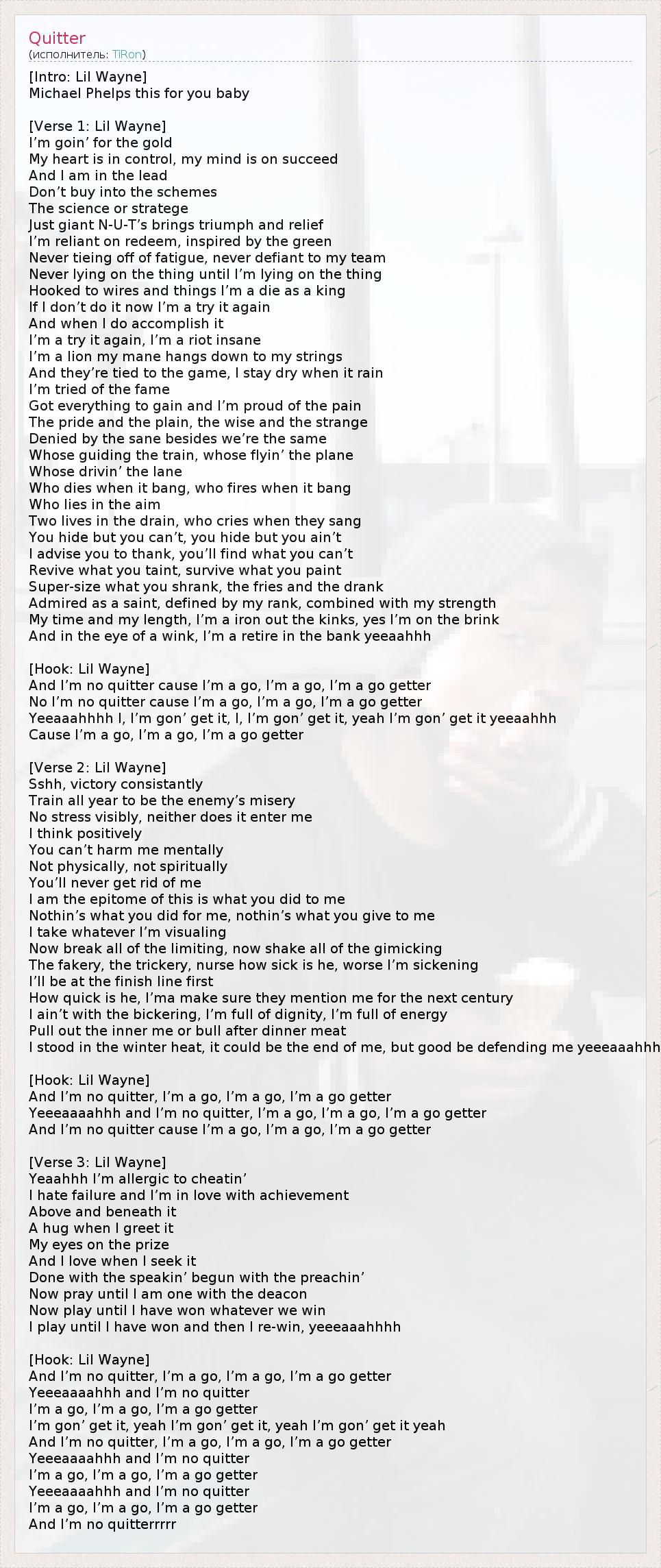 No I’m no quitter cause I’m a go, I’m a go, I’m a go getter