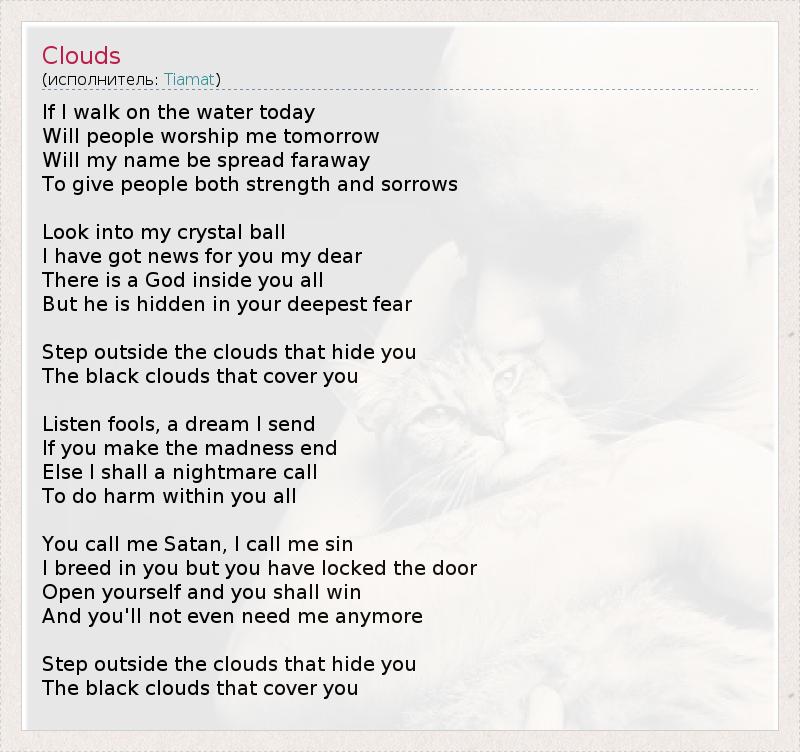If I walk on the water today Will people worship me tomorrow Will my name be spread faraway To give people both strength and sorrows Look into my crystal ball I have got news for you my dear There is a God inside you all But he is hidden in your deepest fear Step outside the clouds that hide you The black clouds that cover you Listen fools, a dream I send If you make the madness end Else I shall a nightmare call To do harm within you all You call me Satan, I call me sin I breed in you but you have locked the door Open yourself and you shall win And you'll not even need me anymore Step outside the clouds that hide you The black clouds that cover you