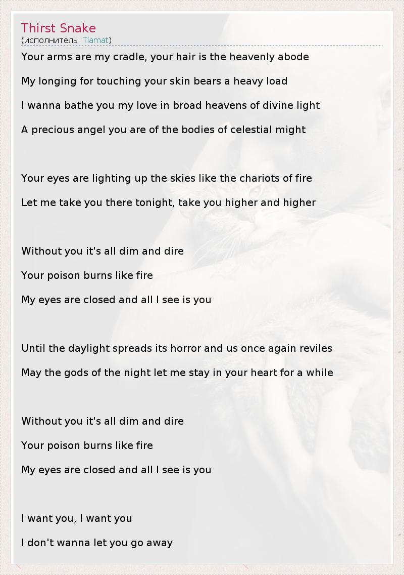 Your arms are my cradle, your hair is the heavenly abode My longing for touching your skin bears a heavy load I wanna bathe you my love in broad heavens of divine light A precious angel you are of the bodies of celestial might Your eyes are lighting up the skies like the chariots of fire Let me take you there tonight, take you higher and higher Without you it's all dim and dire Your poison burns like fire My eyes are closed and all I see is you Until the daylight spreads its horror and us once again reviles May the gods of the night let me stay in your heart for a while Without you it's all dim and dire Your poison burns like fire My eyes are closed and all I see is you I want you, I want you I don't wanna let you go away
