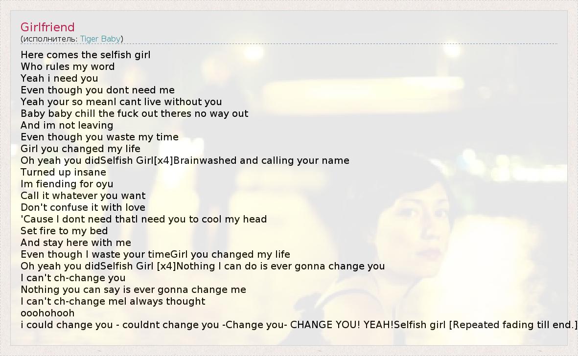 i could change you - couldnt change you -Change you- CHANGE YOU! YEAH!Selfish girl [Repeated fading till end.]