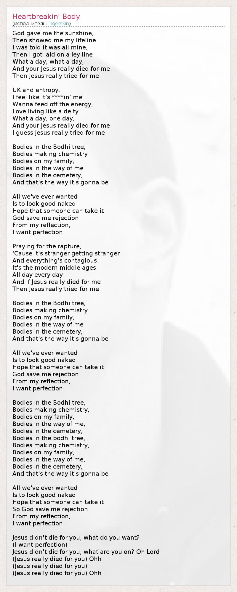 God gave me the sunshine, Then showed me my lifeline I was told it was all mine, Then I got laid on a ley line What a day, what a day, And your Jesus really died for me Then Jesus really tried for me UK and entropy, I feel like it's ****in' me Wanna feed off the energy, Love living like a deity What a day, one day, And your Jesus really died for me I guess Jesus really tried for me Bodies in the Bodhi tree, Bodies making chemistry Bodies on my family, Bodies in the way of me Bodies in the cemetery, And that's the way it's gonna be All we've ever wanted Is to look good naked Hope that someone can take it God save me rejection From my reflection, I want perfection Praying for the rapture, ‘Cause it's stranger getting stranger And everything's contagious It's the modern middle ages All day every day And if Jesus really died for me Then Jesus really tried for me Bodies in the Bodhi tree, Bodies making chemistry Bodies on my family, Bodies in the way of me Bodies in the cemetery, And that's the way it's gonna be All we've ever wanted Is to look good naked Hope that someone can take it God save me rejection From my reflection, I want perfection Bodies in the Bodhi tree, Bodies making chemistry, Bodies on my family, Bodies in the way of me, Bodies in the cemetery, Bodies in the bodhi tree, Bodies making chemistry, Bodies on my family, Bodies in the way of me, Bodies in the cemetery, And that's the way it's gonna be All we've ever wanted Is to look good naked Hope that someone can take it So God save me rejection From my reflection, I want perfection Jesus didn't die for you, what do you want? (I want perfection) Jesus didn't die for you, what are you on? Oh Lord (Jesus really died for you) Ohh (Jesus really died for you) (Jesus really died for you) Ohh
