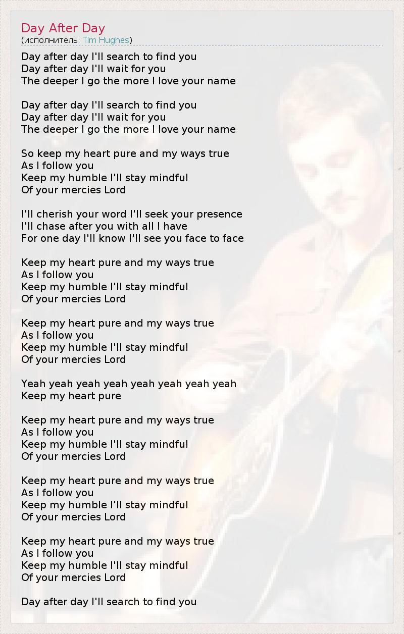 Day after day I'll search to find you Day after day I'll wait for you The deeper I go the more I love your name Day after day I'll search to find you Day after day I'll wait for you The deeper I go the more I love your name So keep my heart pure and my ways true As I follow you Keep my humble I'll stay mindful Of your mercies Lord I'll cherish your word I'll seek your presence I'll chase after you with all I have For one day I'll know I'll see you face to face Keep my heart pure and my ways true As I follow you Keep my humble I'll stay mindful Of your mercies Lord Keep my heart pure and my ways true As I follow you Keep my humble I'll stay mindful Of your mercies Lord Yeah yeah yeah yeah yeah yeah yeah yeah Keep my heart pure Keep my heart pure and my ways true As I follow you Keep my humble I'll stay mindful Of your mercies Lord Keep my heart pure and my ways true As I follow you Keep my humble I'll stay mindful Of your mercies Lord Keep my heart pure and my ways true As I follow you Keep my humble I'll stay mindful Of your mercies Lord Day after day I'll search to find you