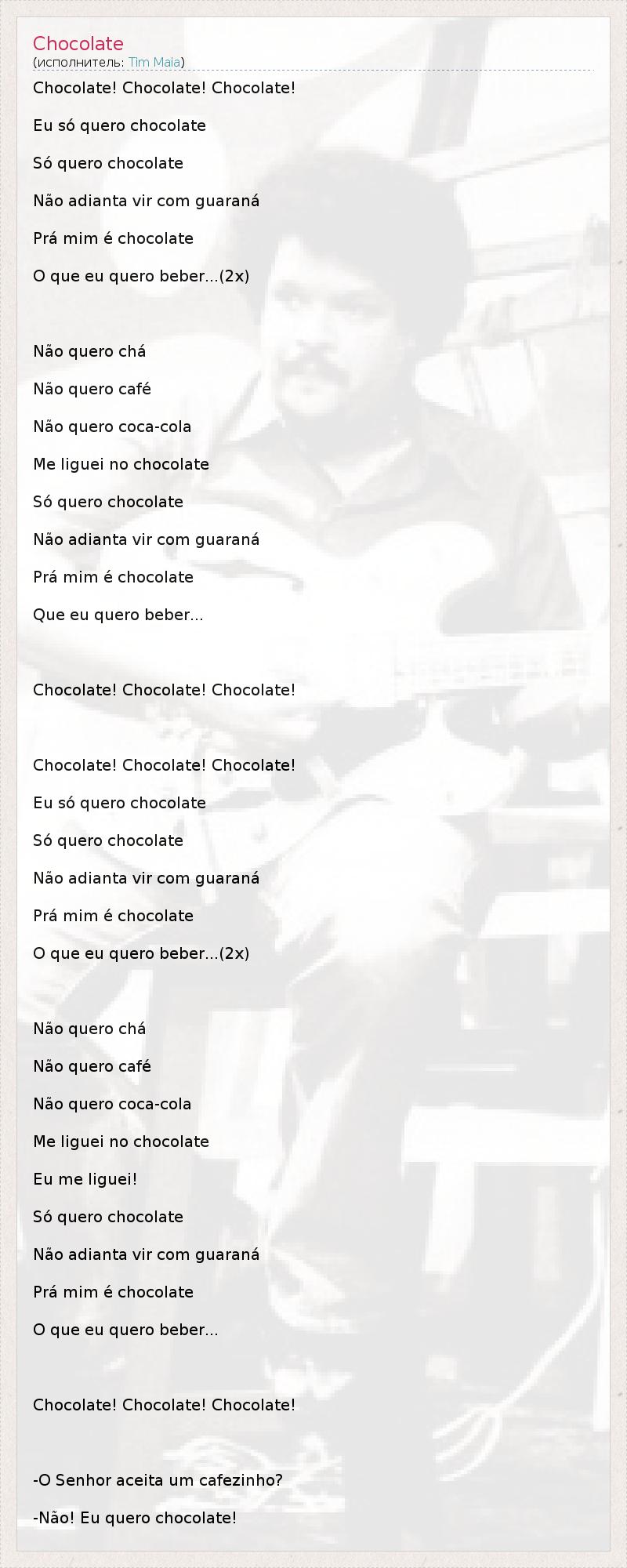 Chocolate! Chocolate! Chocolate! Eu só quero chocolate Só quero chocolate Não adianta vir com guaraná Prá mim é chocolate O que eu quero beber...(2x) Não quero chá Não quero café Não quero coca-cola Me liguei no chocolate Só quero chocolate Não adianta vir com guaraná Prá mim é chocolate Que eu quero beber... Chocolate! Chocolate! Chocolate! Chocolate! Chocolate! Chocolate! Eu só quero chocolate Só quero chocolate Não adianta vir com guaraná Prá mim é chocolate O que eu quero beber...(2x) Não quero chá Não quero café Não quero coca-cola Me liguei no chocolate Eu me liguei! Só quero chocolate Não adianta vir com guaraná Prá mim é chocolate O que eu quero beber... Chocolate! Chocolate! Chocolate! -O Senhor aceita um cafezinho? -Não! Eu quero chocolate!