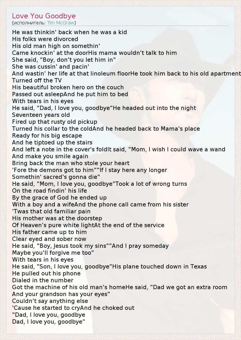 He was thinkin' back when he was a kid His folks were divorced His old man high on somethin' Came knockin' at the doorHis mama wouldn't talk to him She said, "Boy, don't you let him in" She was cussin' and pacin' And wastin' her life at that linoleum floorHe took him back to his old apartment Turned off the TV His beautiful broken hero on the couch Passed out asleepAnd he put him to bed With tears in his eyes He said, "Dad, I love you, goodbye"He headed out into the night Seventeen years old Fired up that rusty old pickup Turned his collar to the coldAnd he headed back to Mama's place Ready for his big escape And he tiptoed up the stairs And left a note in the cover's foldIt said, "Mom, I wish I could wave a wand And make you smile again Bring back the man who stole your heart 'Fore the demons got to him""If I stay here any longer Somethin' sacred's gonna die" He said, "Mom, I love you, goodbye"Took a lot of wrong turns On the road findin' his life By the grace of God he ended up With a boy and a wifeAnd the phone call came from his sister 'Twas that old familiar pain His mother was at the doorstep Of Heaven's pure white lightAt the end of the service His father came up to him Clear eyed and sober now He said, "Boy, Jesus took my sins""And I pray someday Maybe you'll forgive me too" With tears in his eyes He said, "Son, I love you, goodbye"His plane touched down in Texas He pulled out his phone Dialed in the number Got the machine of his old man's homeHe said, "Dad we got an extra room And your grandson has your eyes" Couldn't say anything else 'Cause he started to cryAnd he choked out "Dad, I love you, goodbye Dad, I love you, goodbye"