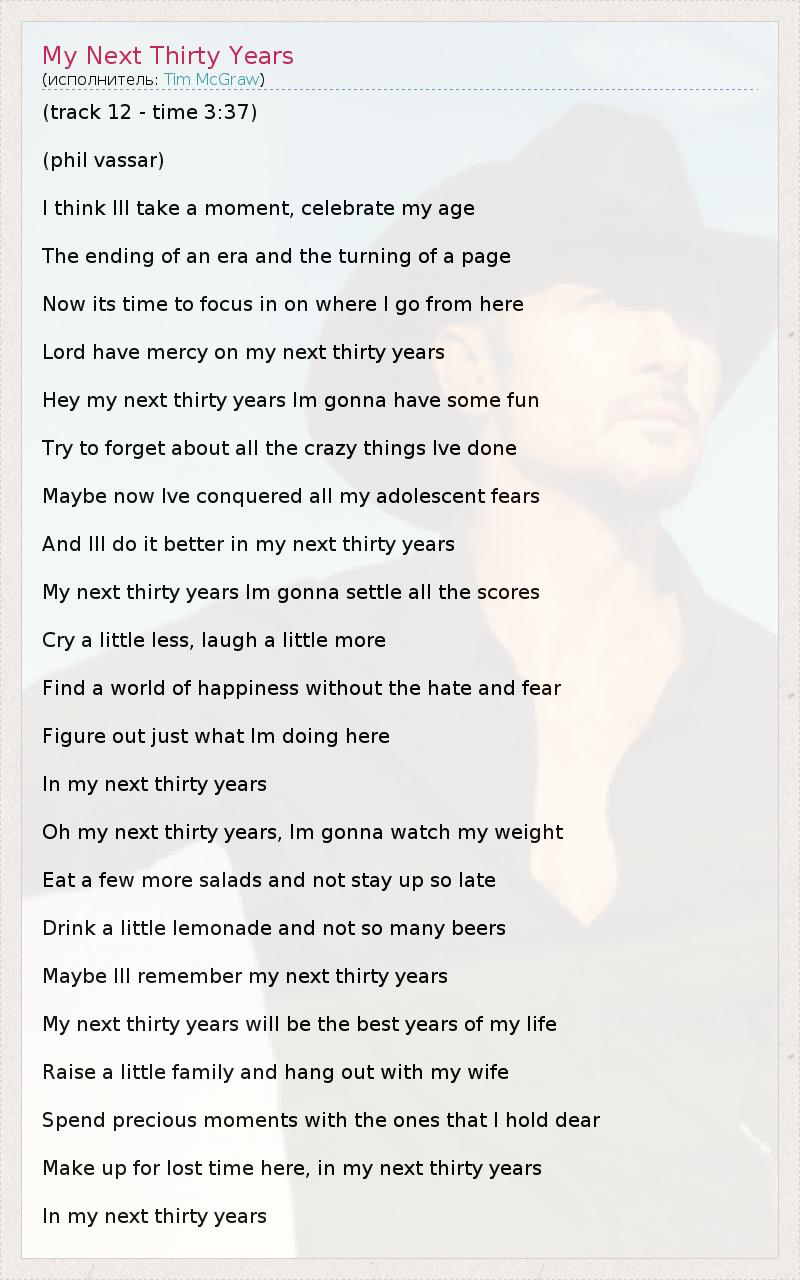 (track 12 - time 3:37) (phil vassar) I think Ill take a moment, celebrate my age The ending of an era and the turning of a page Now its time to focus in on where I go from here Lord have mercy on my next thirty years Hey my next thirty years Im gonna have some fun Try to forget about all the crazy things Ive done Maybe now Ive conquered all my adolescent fears And Ill do it better in my next thirty years My next thirty years Im gonna settle all the scores Cry a little less, laugh a little more Find a world of happiness without the hate and fear Figure out just what Im doing here In my next thirty years Oh my next thirty years, Im gonna watch my weight Eat a few more salads and not stay up so late Drink a little lemonade and not so many beers Maybe Ill remember my next thirty years My next thirty years will be the best years of my life Raise a little family and hang out with my wife Spend precious moments with the ones that I hold dear Make up for lost time here, in my next thirty years In my next thirty years
