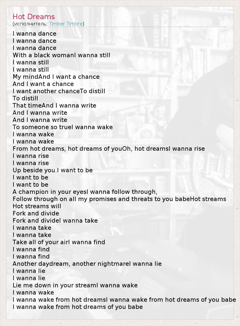 I wanna dance I wanna dance I wanna dance With a black womanI wanna still I wanna still I wanna still My mindAnd I want a chance And I want a chance I want another chanceTo distill To distill That timeAnd I wanna write And I wanna write And I wanna write To someone so trueI wanna wake I wanna wake I wanna wake From hot dreams, hot dreams of youOh, hot dreamsI wanna rise I wanna rise I wanna rise Up beside you.I want to be I want to be I want to be A champion in your eyesI wanna follow through, Follow through on all my promises and threats to you babeHot streams Hot streams will Fork and divide Fork and divideI wanna take I wanna take I wanna take Take all of your airI wanna find I wanna find I wanna find Another daydream, another nightmareI wanna lie I wanna lie I wanna lie Lie me down in your streamI wanna wake I wanna wake I wanna wake from hot dreamsI wanna wake from hot dreams of you babe I wanna wake from hot dreams of you babe