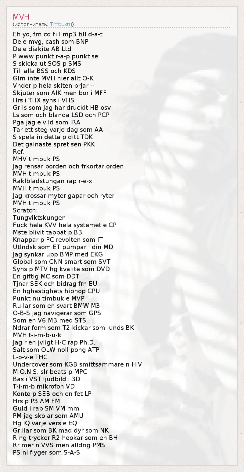 Eh yo, frn cd till mp3 till d-a-t De e mvg, cash som BNP De e diakite AB Ltd P www punkt r-a-p punkt se S skicka ut SOS p SMS Till alla BSS och KDS Glm inte MVH hler allt O-K Vnder p hela skiten brjar -- Skjuter som AIK men bor i MFF Hrs i THX syns i VHS Gr ls som jag har druckit HB osv Ls som och blanda LSD och PCP Pga jag e vild som IRA Tar ett steg varje dag som AA S spela in detta p ditt TDK Det galnaste spret sen PKK Ref: MHV timbuk PS Jag rensar borden och frkortar orden MVH timbuk PS Raklbladstungan rap r-e-x MVH timbuk PS Jag krossar myter gapar och ryter MVH timbuk PS Scratch: Tungviktskungen Fuck hela KVV hela systemet e CP Mste blivit tappat p BB Knappar p PC revolten som IT Utlndsk som ET pumpar i din MD Jag synkar upp BMP med EKG Global som CNN smart som SVT Syns p MTV hg kvalite som DVD En giftig MC som DDT Tjnar SEK och bidrag frn EU En hghastighets hiphop CPU Punkt nu timbuk e MVP Rullar som en svart BMW M3 O-B-S jag navigerar som GPS Som en V6 MB med STS Ndrar form som T2 kickar som lunds BK MVH t-i-m-b-u-k Jag r en jvligt H-C rap Ph.D. Salt som OLW noll pong ATP L-o-v-e THC Undercover som KGB smittsammare n HIV M.O.N.S. slr beats p MPC Bas i VST ljudbild i 3D T-i-m-b mikrofon VD Konto p SEB och en fet LP Hrs p P3 AM FM Guld i rap SM VM mm PM jag skolar som AMU Hg IQ varje vers e EQ Grillar som BK mad dyr som NK Ring trycker R2 hookar som en BH Rr mer n VVS men alldrig PMS PS ni flyger som S-A-S