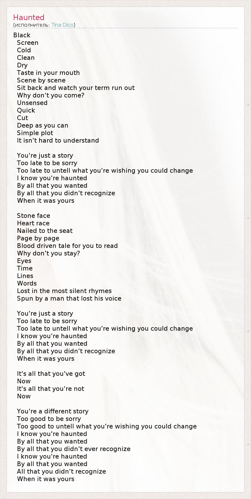 Black Screen Cold Clean Dry Taste in your mouth Scene by scene Sit back and watch your term run out Why don't you come? Unsensed Quick Cut Deep as you can Simple plot It isn't hard to understand You're just a story Too late to be sorry Too late to untell what you're wishing you could change I know you're haunted By all that you wanted By all that you didn't recognize When it was yours Stone face Heart race Nailed to the seat Page by page Blood driven tale for you to read Why don't you stay? Eyes Time Lines Words Lost in the most silent rhymes Spun by a man that lost his voice You're just a story Too late to be sorry Too late to untell what you're wishing you could change I know you're haunted By all that you wanted By all that you didn't recognize When it was yours It's all that you've got Now It's all that you're not Now You're a different story Too good to be sorry Too good to untell what you're wishing you could change I know you're haunted By all that you wanted By all that you didn't ever recognize I know you're haunted By all that you wanted All that you didn't recognize When it was yours