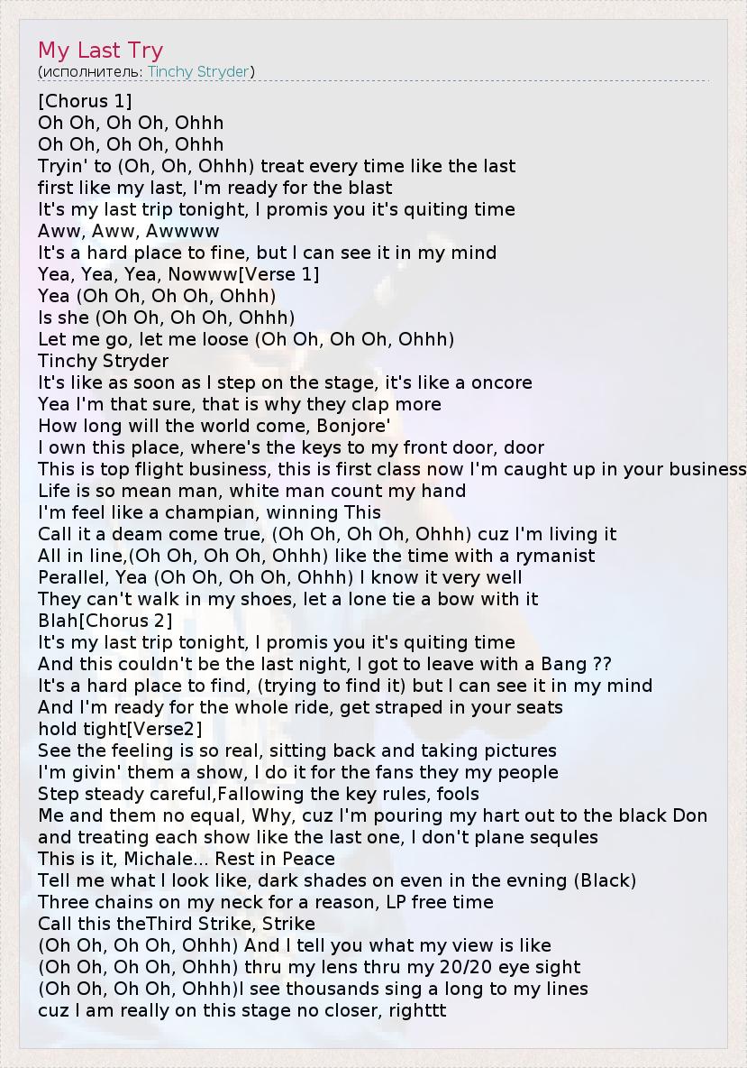 [Chorus 1] Oh Oh, Oh Oh, Ohhh Oh Oh, Oh Oh, Ohhh Tryin' to (Oh, Oh, Ohhh) treat every time like the last first like my last, I'm ready for the blast It's my last trip tonight, I promis you it's quiting time Aww, Aww, Awwww It's a hard place to fine, but I can see it in my mind Yea, Yea, Yea, Nowww[Verse 1] Yea (Oh Oh, Oh Oh, Ohhh) Is she (Oh Oh, Oh Oh, Ohhh) Let me go, let me loose (Oh Oh, Oh Oh, Ohhh) Tinchy Stryder It's like as soon as I step on the stage, it's like a oncore Yea I'm that sure, that is why they clap more How long will the world come, Bonjore' I own this place, where's the keys to my front door, door This is top flight business, this is first class now I'm caught up in your business Life is so mean man, white man count my hand I'm feel like a champian, winning This Call it a deam come true, (Oh Oh, Oh Oh, Ohhh) cuz I'm living it All in line,(Oh Oh, Oh Oh, Ohhh) like the time with a rymanist Perallel, Yea (Oh Oh, Oh Oh, Ohhh) I know it very well They can't walk in my shoes, let a lone tie a bow with it Blah[Chorus 2] It's my last trip tonight, I promis you it's quiting time And this couldn't be the last night, I got to leave with a Bang ?? It's a hard place to find, (trying to find it) but I can see it in my mind And I'm ready for the whole ride, get straped in your seats hold tight[Verse2] See the feeling is so real, sitting back and taking pictures I'm givin' them a show, I do it for the fans they my people Step steady careful,Fallowing the key rules, fools Me and them no equal, Why, cuz I'm pouring my hart out to the black Don and treating each show like the last one, I don't plane sequles This is it, Michale... Rest in Peace Tell me what I look like, dark shades on even in the evning (Black) Three chains on my neck for a reason, LP free time Call this theThird Strike, Strike (Oh Oh, Oh Oh, Ohhh) And I tell you what my view is like (Oh Oh, Oh Oh, Ohhh) thru my lens thru my 20/20 eye sight (Oh Oh, Oh Oh, Ohhh)I see thousands sing a long to my lines cuz I am really on this stage no closer, righttt
