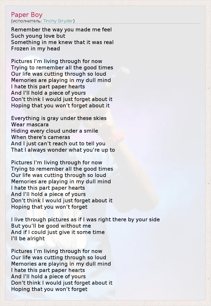 Remember the way you made me feel Such young love but Something in me knew that it was real Frozen in my head Pictures I'm living through for now Trying to remember all the good times Our life was cutting through so loud Memories are playing in my dull mind I hate this part paper hearts And I'll hold a piece of yours Don't think I would just forget about it Hoping that you won't forget about it Everything is gray under these skies Wear mascara Hiding every cloud under a smile When there's cameras And I just can't reach out to tell you That I always wonder what you're up to Pictures I'm living through for now Trying to remember all the good times Our life was cutting through so loud Memories are playing in my dull mind I hate this part paper hearts And I'll hold a piece of yours Don't think I would just forget about it Hoping that you won't forget I live through pictures as if I was right there by your side But you'll be good without me And if I could just give it some time I'll be alright Pictures I'm living through for now Our life was cutting through so loud Memories are playing in my dull mind I hate this part paper hearts And I'll hold a piece of yours Don't think I would just forget about it Hoping that you won't forget