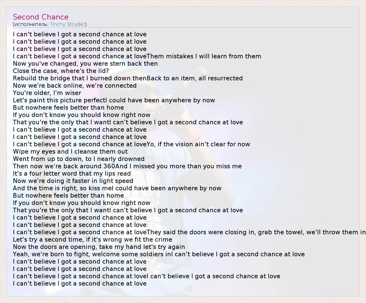I can't believe I got a second chance at love I can't believe I got a second chance at love I can't believe I got a second chance at love I can't believe I got a second chance at loveThem mistakes I will learn from them Now you've changed, you were stern back then Close the case, where's the lid? Rebuild the bridge that I burned down thenBack to an item, all resurrected Now we're back online, we're connected You're older, I'm wiser Let's paint this picture perfectI could have been anywhere by now But nowhere feels better than home If you don't know you should know right now That you're the only that I wantI can't believe I got a second chance at love I can't believe I got a second chance at love I can't believe I got a second chance at love I can't believe I got a second chance at loveYo, if the vision ain't clear for now Wipe my eyes and I cleanse them out Went from up to down, to I nearly drowned Then now we're back around 360And I missed you more than you miss me It's a four letter word that my lips read Now we're doing it faster in light speed And the time is right, so kiss meI could have been anywhere by now But nowhere feels better than home If you don't know you should know right now That you're the only that I wantI can't believe I got a second chance at love I can't believe I got a second chance at love I can't believe I got a second chance at love I can't believe I got a second chance at loveThey said the doors were closing in, grab the towel, we'll throw them in Let's try a second time, if it's wrong we fit the crime Now the doors are opening, take my hand let's try again Yeah, we're born to fight, welcome some soldiers inI can't believe I got a second chance at love I can't believe I got a second chance at love I can't believe I got a second chance at love I can't believe I got a second chance at loveI can't believe I got a second chance at love I can't believe I got a second chance at love