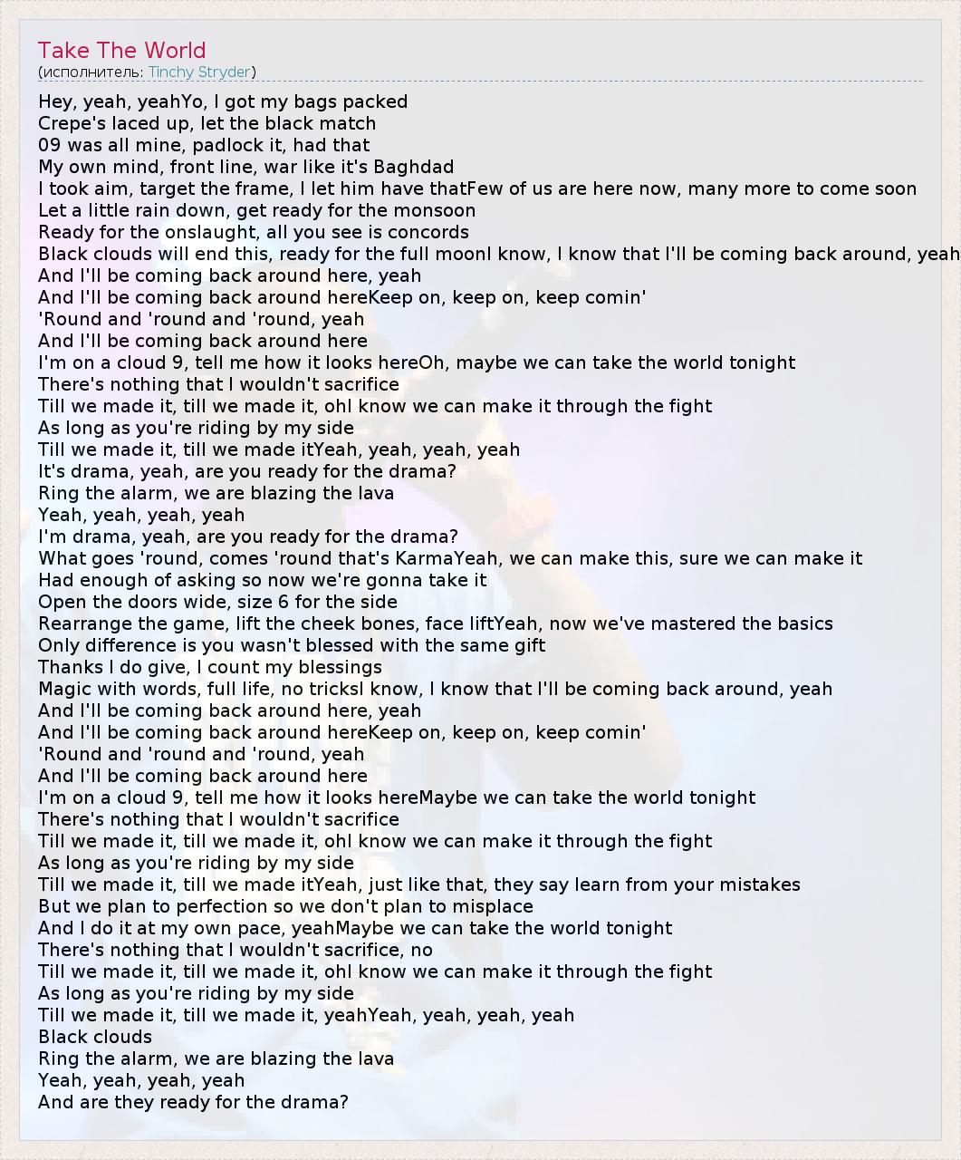 А как ты думаешь, о чем песня "Take The World" ?