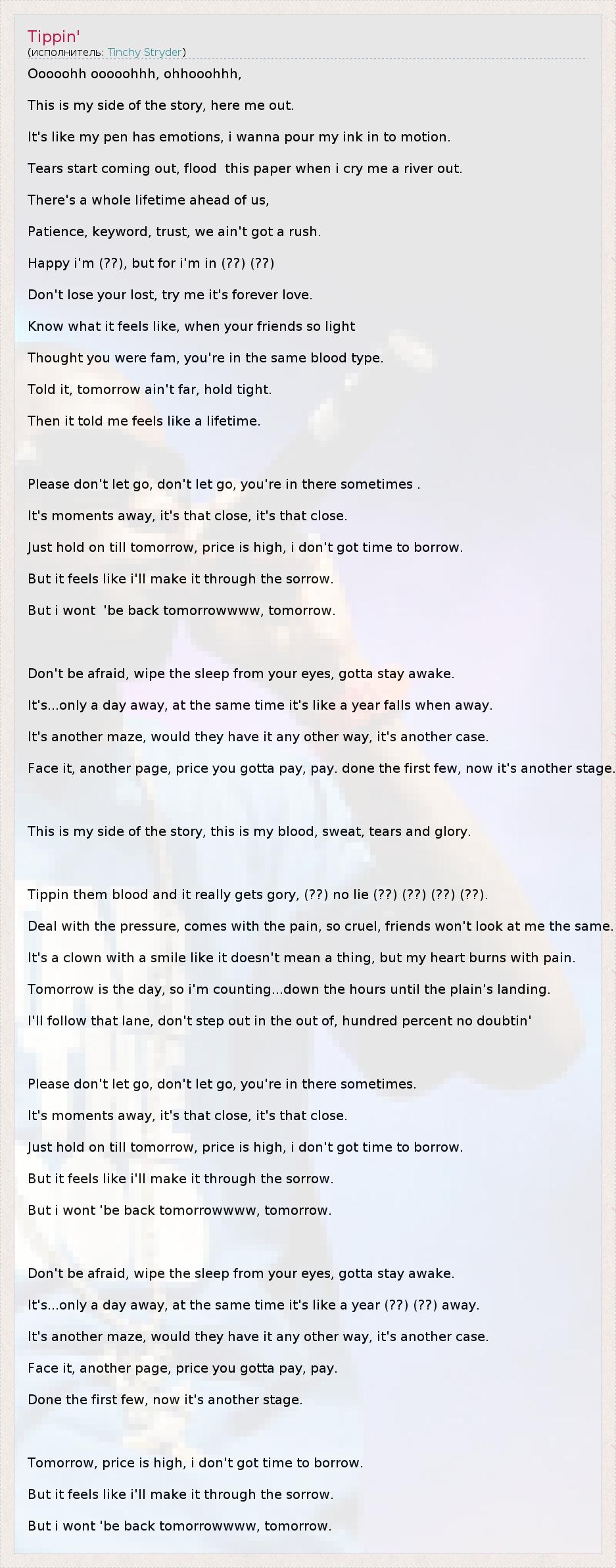 Ooooohh ooooohhh, ohhooohhh, This is my side of the story, here me out. It's like my pen has emotions, i wanna pour my ink in to motion. Tears start coming out, flood this paper when i cry me a river out. There's a whole lifetime ahead of us, Patience, keyword, trust, we ain't got a rush. Happy i'm (??), but for i'm in (??) (??) Don't lose your lost, try me it's forever love. Know what it feels like, when your friends so light Thought you were fam, you're in the same blood type. Told it, tomorrow ain't far, hold tight. Then it told me feels like a lifetime. Please don't let go, don't let go, you're in there sometimes . It's moments away, it's that close, it's that close. Just hold on till tomorrow, price is high, i don't got time to borrow. But it feels like i'll make it through the sorrow. But i wont 'be back tomorrowwww, tomorrow. Don't be afraid, wipe the sleep from your eyes, gotta stay awake. It's...only a day away, at the same time it's like a year falls when away. It's another maze, would they have it any other way, it's another case. Face it, another page, price you gotta pay, pay. done the first few, now it's another stage. This is my side of the story, this is my blood, sweat, tears and glory. Tippin them blood and it really gets gory, (??) no lie (??) (??) (??) (??). Deal with the pressure, comes with the pain, so cruel, friends won't look at me the same. It's a clown with a smile like it doesn't mean a thing, but my heart burns with pain. Tomorrow is the day, so i'm counting...down the hours until the plain's landing. I'll follow that lane, don't step out in the out of, hundred percent no doubtin' Please don't let go, don't let go, you're in there sometimes. It's moments away, it's that close, it's that close. Just hold on till tomorrow, price is high, i don't got time to borrow. But it feels like i'll make it through the sorrow. But i wont 'be back tomorrowwww, tomorrow. Don't be afraid, wipe the sleep from your eyes, gotta stay awake. It's...only a day away, at the same time it's like a year (??) (??) away. It's another maze, would they have it any other way, it's another case. Face it, another page, price you gotta pay, pay. Done the first few, now it's another stage. Tomorrow, price is high, i don't got time to borrow. But it feels like i'll make it through the sorrow. But i wont 'be back tomorrowwww, tomorrow.