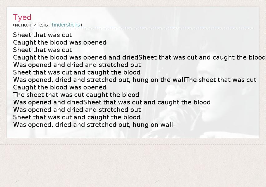 Sheet that was cut Caught the blood was opened Sheet that was cut Caught the blood was opened and driedSheet that was cut and caught the blood Was opened and dried and stretched out Sheet that was cut and caught the blood Was opened, dried and stretched out, hung on the wallThe sheet that was cut Caught the blood was opened The sheet that was cut caught the blood Was opened and driedSheet that was cut and caught the blood Was opened and dried and stretched out Sheet that was cut and caught the blood Was opened, dried and stretched out, hung on wall
