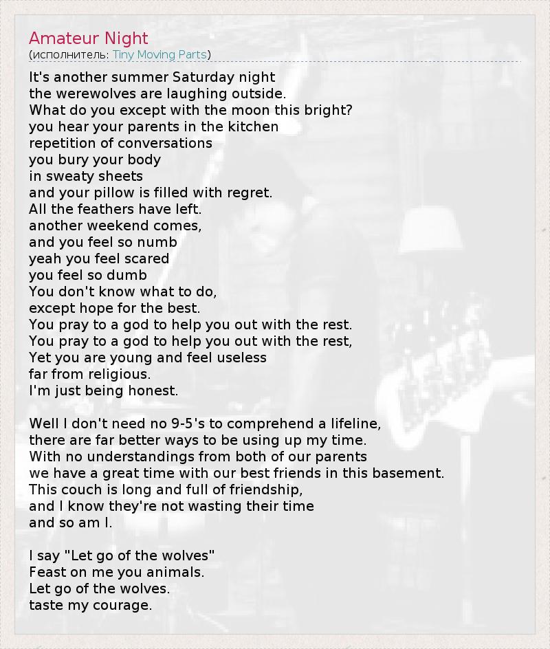 Это еще один летом в субботу вечером оборотни смеются снаружи. Что вы , кроме как с луны это ярко ? Вы слышите своих родителей на кухне повторение разговоров Вы похоронить свое тело в потных простынях и ваша подушка наполняется сожалением . Все перья оставили . другой выходные приходит , и вы чувствуете себя настолько онемели да вы чувствовать себя страшно Вы чувствуете, настолько глуп Вы не знаете, что делать , кроме надеяться на лучшее . Вы молятся богу, чтобы помочь вам с остальными. Вы молятся богу, чтобы помочь вам с остальными , Тем не менее, вы молоды и чувствовать себя бесполезным далеко не религиозный . Я просто честен . Ну, я не нужно не 9-5 , чтобы понять спасательный круг , Есть гораздо более эффективные способы использовать мое время . При отсутствии договоренностей с обоих наших родителей мы прекрасно провести время с нашими лучшими друзьями в этом подвале. Этот диван длинный и полный дружбы , и я знаю, что они не тратят свое время и я тоже Я говорю: " Отпусти волков " Праздник на мне, что ты животных . Отпусти волков. вкус свое мужество .