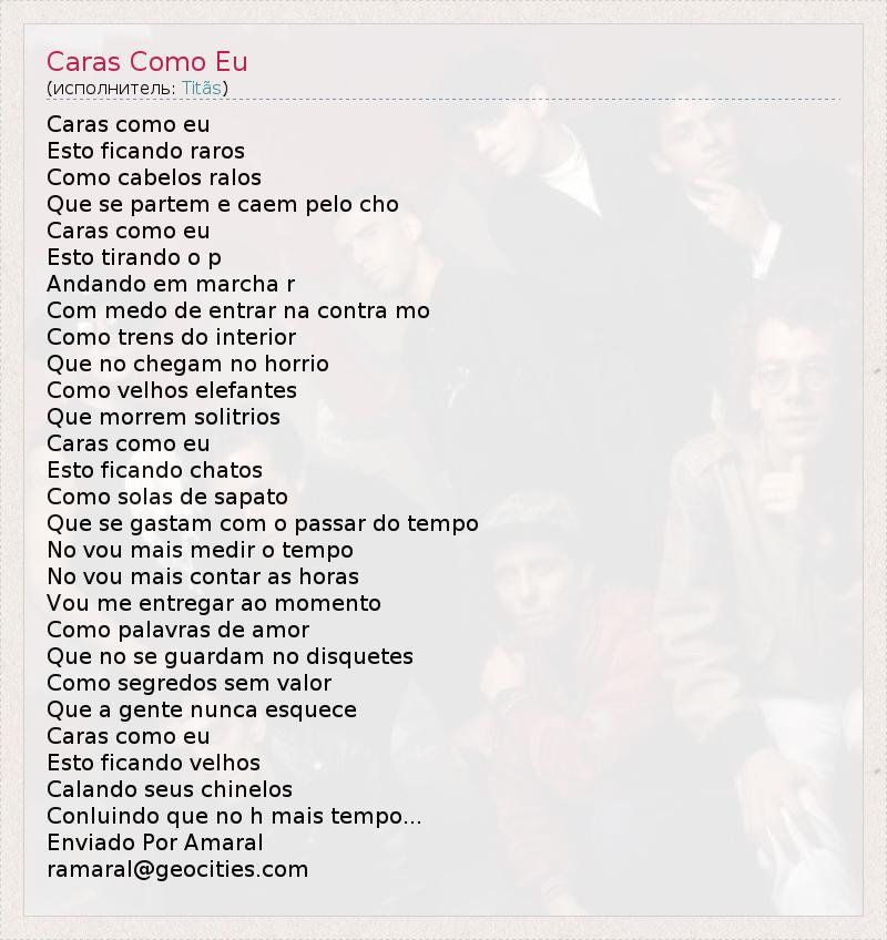 Caras como eu Esto ficando raros Como cabelos ralos Que se partem e caem pelo cho Caras como eu Esto tirando o p Andando em marcha r Com medo de entrar na contra mo Como trens do interior Que no chegam no horrio Como velhos elefantes Que morrem solitrios Caras como eu Esto ficando chatos Como solas de sapato Que se gastam com o passar do tempo No vou mais medir o tempo No vou mais contar as horas Vou me entregar ao momento Como palavras de amor Que no se guardam no disquetes Como segredos sem valor Que a gente nunca esquece Caras como eu Esto ficando velhos Calando seus chinelos Conluindo que no h mais tempo... Enviado Por Amaral ramaral@geocities.com