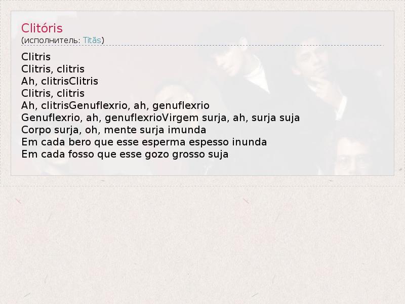 Clitris Clitris, clitris Ah, clitrisClitris Clitris, clitris Ah, clitrisGenuflexrio, ah, genuflexrio Genuflexrio, ah, genuflexrioVirgem surja, ah, surja suja Corpo surja, oh, mente surja imunda Em cada bero que esse esperma espesso inunda Em cada fosso que esse gozo grosso suja