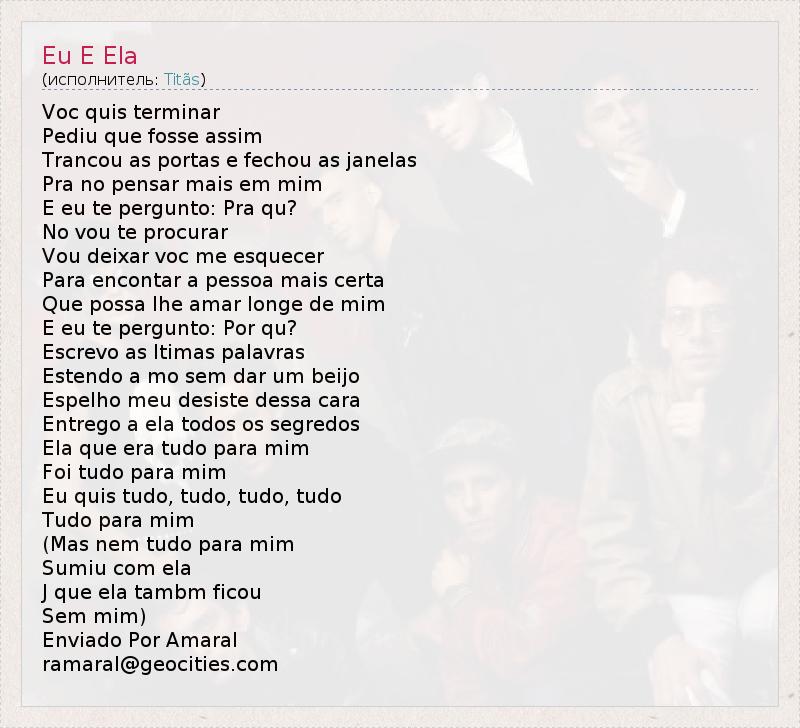 Voc quis terminar Pediu que fosse assim Trancou as portas e fechou as janelas Pra no pensar mais em mim E eu te pergunto: Pra qu? No vou te procurar Vou deixar voc me esquecer Para encontar a pessoa mais certa Que possa lhe amar longe de mim E eu te pergunto: Por qu? Escrevo as ltimas palavras Estendo a mo sem dar um beijo Espelho meu desiste dessa cara Entrego a ela todos os segredos Ela que era tudo para mim Foi tudo para mim Eu quis tudo, tudo, tudo, tudo Tudo para mim (Mas nem tudo para mim Sumiu com ela J que ela tambm ficou Sem mim) Enviado Por Amaral ramaral@geocities.com