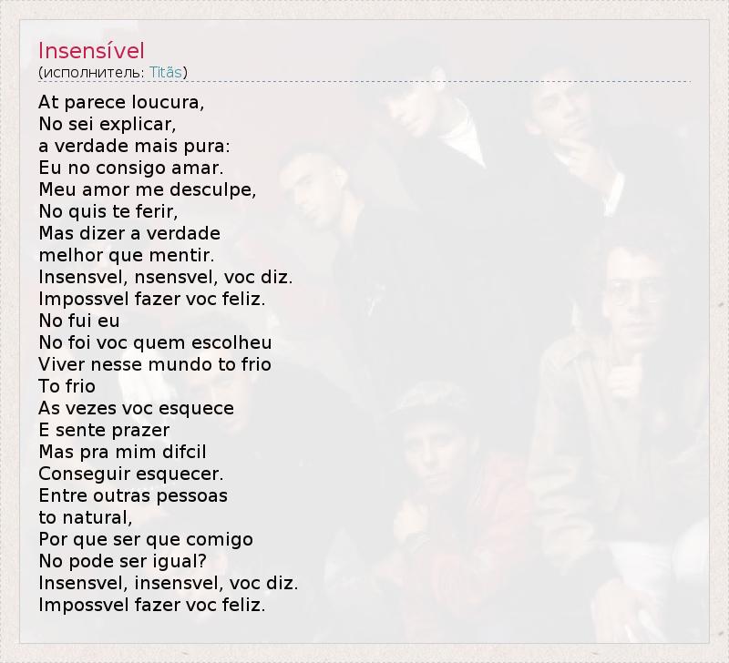 At parece loucura, No sei explicar, a verdade mais pura: Eu no consigo amar. Meu amor me desculpe, No quis te ferir, Mas dizer a verdade melhor que mentir. Insensvel, nsensvel, voc diz. Impossvel fazer voc feliz. No fui eu No foi voc quem escolheu Viver nesse mundo to frio To frio As vezes voc esquece E sente prazer Mas pra mim difcil Conseguir esquecer. Entre outras pessoas to natural, Por que ser que comigo No pode ser igual? Insensvel, insensvel, voc diz. Impossvel fazer voc feliz.