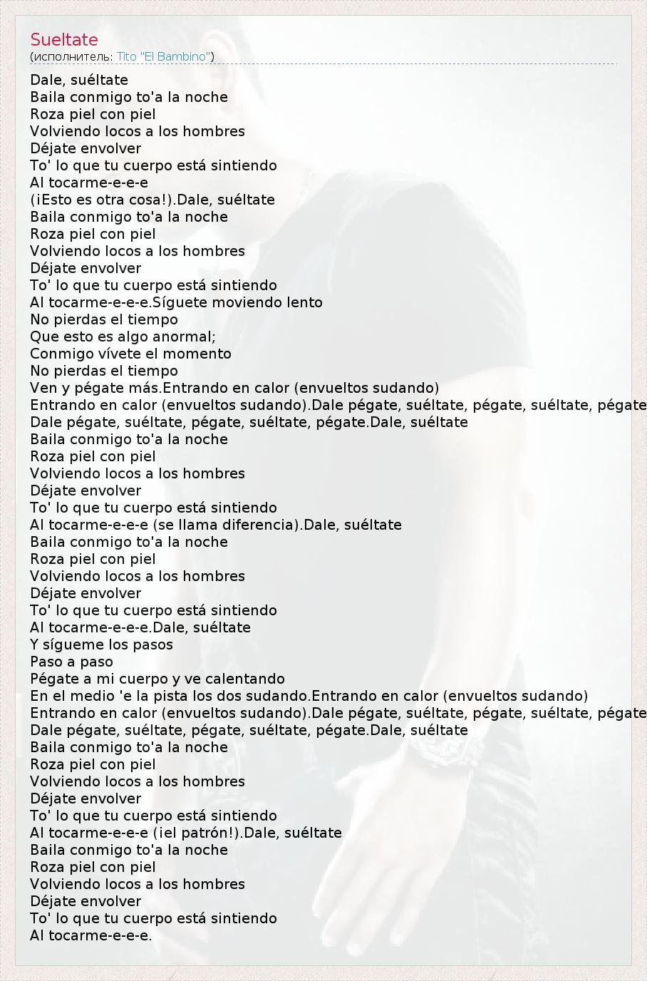 Dale, suéltate Baila conmigo to'a la noche Roza piel con piel Volviendo locos a los hombres Déjate envolver To' lo que tu cuerpo está sintiendo Al tocarme-e-e-e (¡Esto es otra cosa!).Dale, suéltate Baila conmigo to'a la noche Roza piel con piel Volviendo locos a los hombres Déjate envolver To' lo que tu cuerpo está sintiendo Al tocarme-e-e-e.Síguete moviendo lento No pierdas el tiempo Que esto es algo anormal; Conmigo vívete el momento No pierdas el tiempo Ven y pégate más.Entrando en calor (envueltos sudando) Entrando en calor (envueltos sudando).Dale pégate, suéltate, pégate, suéltate, pégate Dale pégate, suéltate, pégate, suéltate, pégate.Dale, suéltate Baila conmigo to'a la noche Roza piel con piel Volviendo locos a los hombres Déjate envolver To' lo que tu cuerpo está sintiendo Al tocarme-e-e-e (se llama diferencia).Dale, suéltate Baila conmigo to'a la noche Roza piel con piel Volviendo locos a los hombres Déjate envolver To' lo que tu cuerpo está sintiendo Al tocarme-e-e-e.Dale, suéltate Y sígueme los pasos Paso a paso Pégate a mi cuerpo y ve calentando En el medio 'e la pista los dos sudando.Entrando en calor (envueltos sudando) Entrando en calor (envueltos sudando).Dale pégate, suéltate, pégate, suéltate, pégate Dale pégate, suéltate, pégate, suéltate, pégate.Dale, suéltate Baila conmigo to'a la noche Roza piel con piel Volviendo locos a los hombres Déjate envolver To' lo que tu cuerpo está sintiendo Al tocarme-e-e-e (¡el patrón!).Dale, suéltate Baila conmigo to'a la noche Roza piel con piel Volviendo locos a los hombres Déjate envolver To' lo que tu cuerpo está sintiendo Al tocarme-e-e-e.