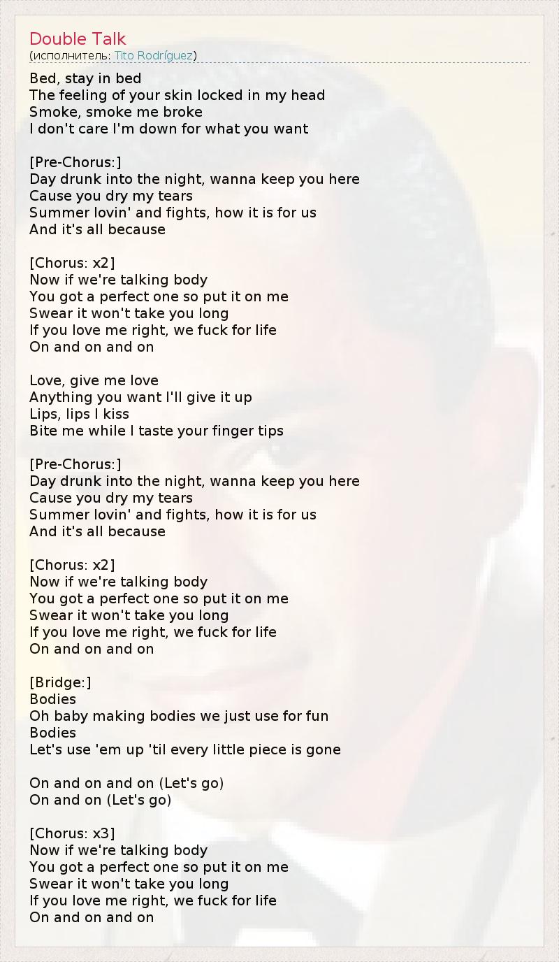 Bed, stay in bed The feeling of your skin locked in my head Smoke, smoke me broke I don't care I'm down for what you want [Pre-Chorus:] Day drunk into the night, wanna keep you here Cause you dry my tears Summer lovin' and fights, how it is for us And it's all because [Chorus: x2] Now if we're talking body You got a perfect one so put it on me Swear it won't take you long If you love me right, we fuck for life On and on and on Love, give me love Anything you want I'll give it up Lips, lips I kiss Bite me while I taste your finger tips [Pre-Chorus:] Day drunk into the night, wanna keep you here Cause you dry my tears Summer lovin' and fights, how it is for us And it's all because [Chorus: x2] Now if we're talking body You got a perfect one so put it on me Swear it won't take you long If you love me right, we fuck for life On and on and on [Bridge:] Bodies Oh baby making bodies we just use for fun Bodies Let's use 'em up 'til every little piece is gone On and on and on (Let's go) On and on (Let's go) [Chorus: x3] Now if we're talking body You got a perfect one so put it on me Swear it won't take you long If you love me right, we fuck for life On and on and on