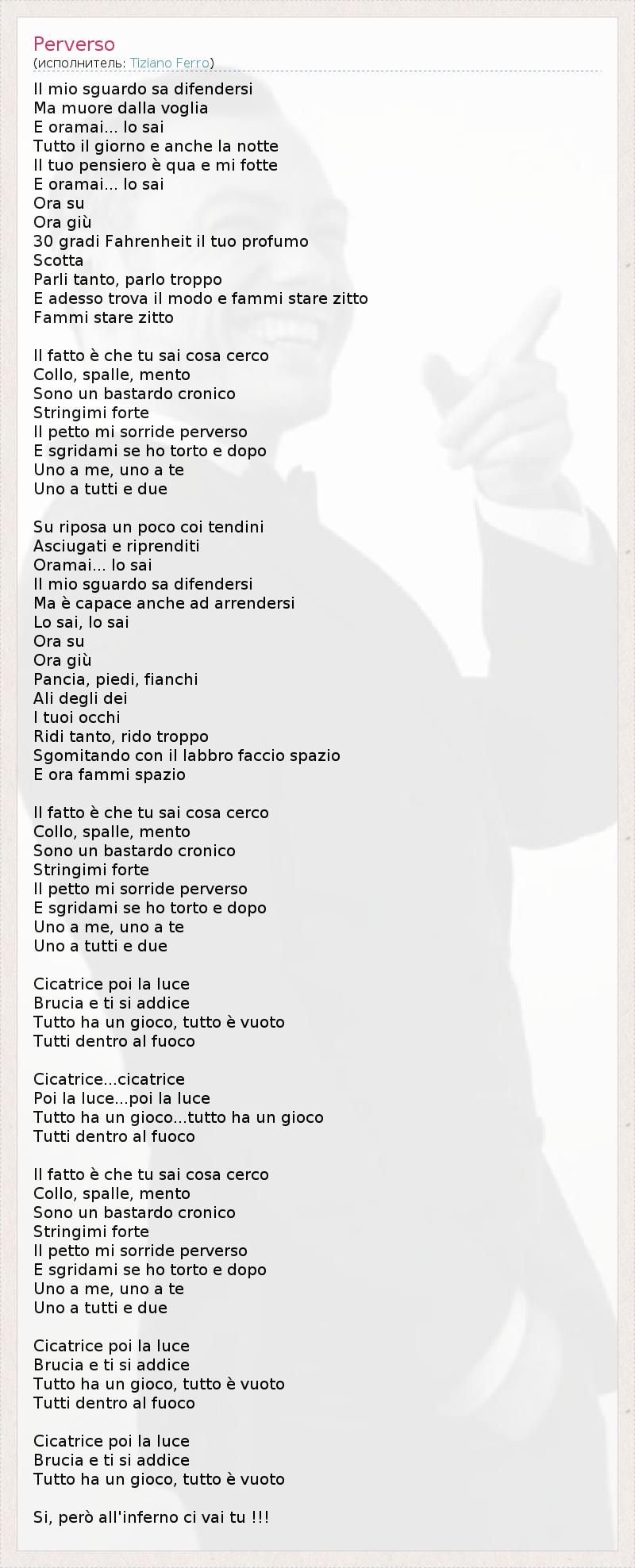 Il mio sguardo sa difendersi Ma muore dalla voglia E oramai... lo sai Tutto il giorno e anche la notte Il tuo pensiero è qua e mi fotte E oramai... lo sai Ora su Ora giù 30 gradi Fahrenheit il tuo profumo Scotta Parli tanto, parlo troppo E adesso trova il modo e fammi stare zitto Fammi stare zitto Il fatto è che tu sai cosa cerco Collo, spalle, mento Sono un bastardo cronico Stringimi forte Il petto mi sorride perverso E sgridami se ho torto e dopo Uno a me, uno a te Uno a tutti e due Su riposa un poco coi tendini Asciugati e riprenditi Oramai... lo sai Il mio sguardo sa difendersi Ma è capace anche ad arrendersi Lo sai, lo sai Ora su Ora giù Pancia, piedi, fianchi Ali degli dei I tuoi occhi Ridi tanto, rido troppo Sgomitando con il labbro faccio spazio E ora fammi spazio Il fatto è che tu sai cosa cerco Collo, spalle, mento Sono un bastardo cronico Stringimi forte Il petto mi sorride perverso E sgridami se ho torto e dopo Uno a me, uno a te Uno a tutti e due Cicatrice poi la luce Brucia e ti si addice Tutto ha un gioco, tutto è vuoto Tutti dentro al fuoco Cicatrice...cicatrice Poi la luce...poi la luce Tutto ha un gioco...tutto ha un gioco Tutti dentro al fuoco Il fatto è che tu sai cosa cerco Collo, spalle, mento Sono un bastardo cronico Stringimi forte Il petto mi sorride perverso E sgridami se ho torto e dopo Uno a me, uno a te Uno a tutti e due Cicatrice poi la luce Brucia e ti si addice Tutto ha un gioco, tutto è vuoto Tutti dentro al fuoco Cicatrice poi la luce Brucia e ti si addice Tutto ha un gioco, tutto è vuoto Si, però all'inferno ci vai tu !!!
