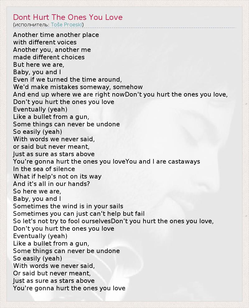 Another time another place with different voices Another you, another me made different choices But here we are, Baby, you and I Even if we turned the time around, We'd make mistakes someway, somehow And end up where we are right nowDon't you hurt the ones you love, Don't you hurt the ones you love Eventually (yeah) Like a bullet from a gun, Some things can never be undone So easily (yeah) With words we never said, or said but never meant, Just as sure as stars above You're gonna hurt the ones you loveYou and I are castaways In the sea of silence What if help's not on its way And it's all in our hands? So here we are, Baby, you and I Sometimes the wind is in your sails Sometimes you can just can't help but fail So let's not try to fool ourselvesDon't you hurt the ones you love, Don't you hurt the ones you love Eventually (yeah) Like a bullet from a gun, Some things can never be undone So easily (yeah) With words we never said, Or said but never meant, Just as sure as stars above You're gonna hurt the ones you love