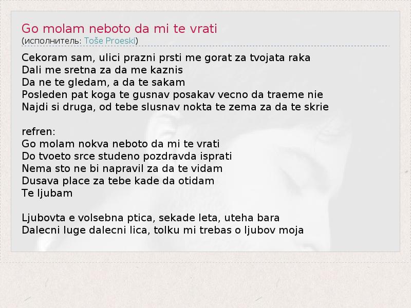 А как ты думаешь, о чем песня "Go molam neboto da mi te vrati" ?