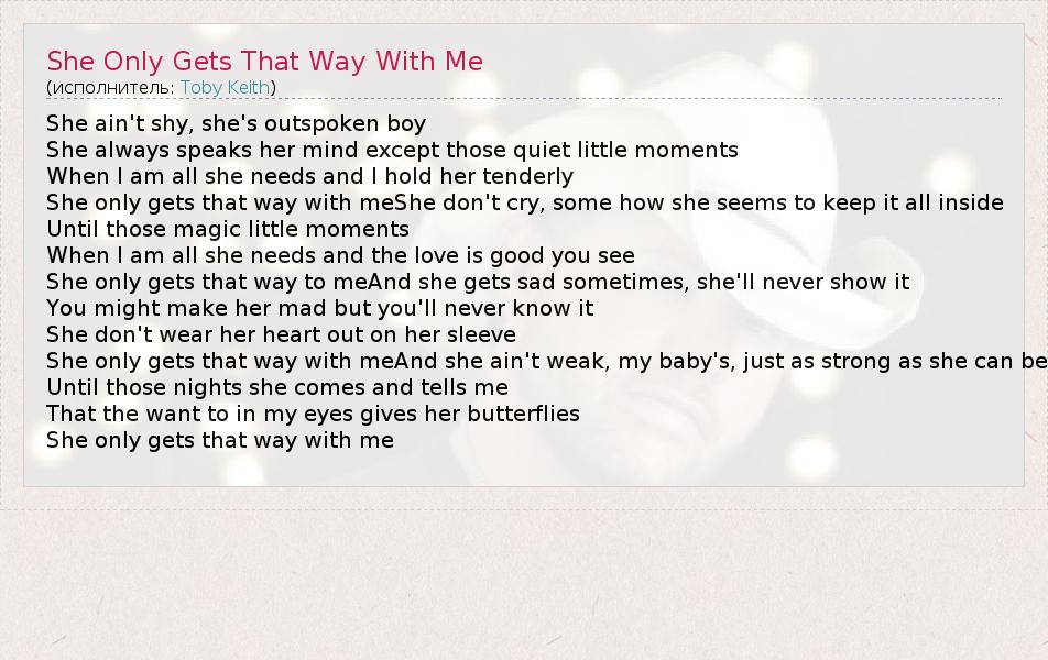 ГлавнаяИсполнителиToby KeithShe Only Gets That Way With Me