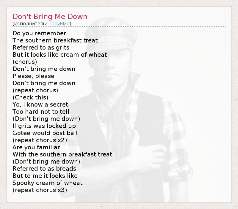 Do you remember The southern breakfast treat Referred to as grits But it looks like cream of wheat (chorus) Don't bring me down Please, please Don't bring me down (repeat chorus) (Check this) Yo, I know a secret Too hard not to tell (Don't bring me down) If grits was locked up Gotee would post bail (repeat chorus x2) Are you familiar With the southern breakfast treat (Don't bring me down) Referred to as breads But to me it looks like Spooky cream of wheat (repeat chorus x3)
