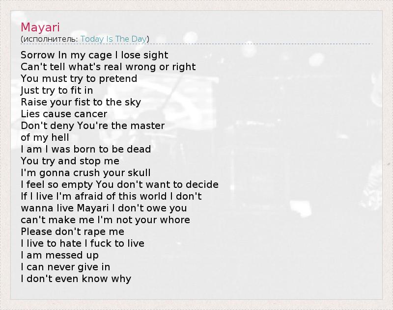 Sorrow In my cage I lose sight Can't tell what's real wrong or right You must try to pretend Just try to fit in Raise your fist to the sky Lies cause cancer Don't deny You're the master of my hell I am I was born to be dead You try and stop me I'm gonna crush your skull I feel so empty You don't want to decide If I live I'm afraid of this world I don't wanna live Mayari I don't owe you can't make me I'm not your whore Please don't rape me I live to hate I fuck to live I am messed up I can never give in I don't even know why