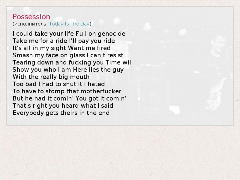 I could take your life Full on genocide Take me for a ride I'll pay you ride It's all in my sight Want me fired Smash my face on glass I can't resist Tearing down and fucking you Time will Show you who I am Here lies the guy With the really big mouth Too bad I had to shut it I hated To have to stomp that motherfucker But he had it comin' You got it comin' That's right you heard what I said Everybody gets theirs in the end