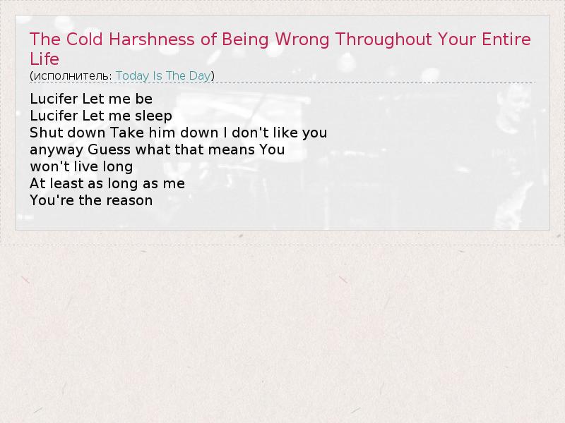 ГлавнаяИсполнителиToday Is The DayThe Cold Harshness of Being Wrong Throughout Your Entire Life