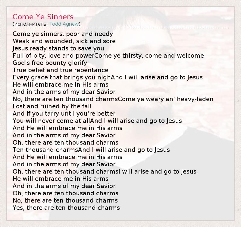 Come ye sinners, poor and needy Weak and wounded, sick and sore Jesus ready stands to save you Full of pity, love and powerCome ye thirsty, come and welcome God's free bounty glorify True belief and true repentance Every grace that brings you nighAnd I will arise and go to Jesus He will embrace me in His arms And in the arms of my dear Savior No, there are ten thousand charmsCome ye weary an' heavy-laden Lost and ruined by the fall And if you tarry until you're better You will never come at allAnd I will arise and go to Jesus And He will embrace me in His arms And in the arms of my dear Savior Oh, there are ten thousand charms Ten thousand charmsAnd I will arise and go to Jesus And He will embrace me in His arms And in the arms of my dear Savior Oh, there are ten thousand charmsI will arise and go to Jesus He will embrace me in His arms And in the arms of my dear Savior Oh, there are ten thousand charms No, there are ten thousand charms Yes, there are ten thousand charms