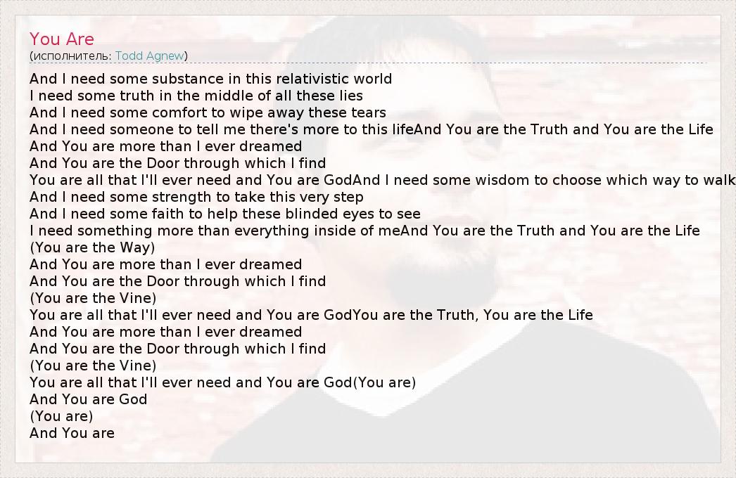 And I need some substance in this relativistic world I need some truth in the middle of all these lies And I need some comfort to wipe away these tears And I need someone to tell me there's more to this lifeAnd You are the Truth and You are the Life And You are more than I ever dreamed And You are the Door through which I find You are all that I'll ever need and You are GodAnd I need some wisdom to choose which way to walk And I need some strength to take this very step And I need some faith to help these blinded eyes to see I need something more than everything inside of meAnd You are the Truth and You are the Life (You are the Way) And You are more than I ever dreamed And You are the Door through which I find (You are the Vine) You are all that I'll ever need and You are GodYou are the Truth, You are the Life And You are more than I ever dreamed And You are the Door through which I find (You are the Vine) You are all that I'll ever need and You are God(You are) And You are God (You are) And You are