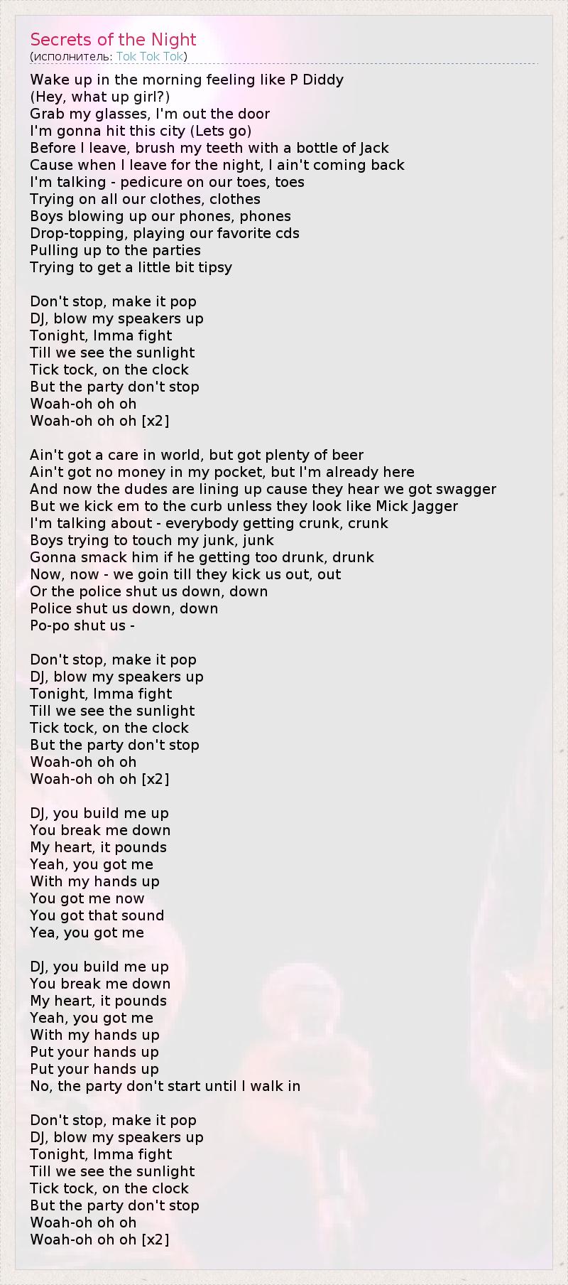 Wake up in the morning feeling like P Diddy (Hey, what up girl?) Grab my glasses, I'm out the door I'm gonna hit this city (Lets go) Before I leave, brush my teeth with a bottle of Jack Cause when I leave for the night, I ain't coming back I'm talking - pedicure on our toes, toes Trying on all our clothes, clothes Boys blowing up our phones, phones Drop-topping, playing our favorite cds Pulling up to the parties Trying to get a little bit tipsy Don't stop, make it pop DJ, blow my speakers up Tonight, Imma fight Till we see the sunlight Tick tock, on the clock But the party don't stop Woah-oh oh oh Woah-oh oh oh [x2] Ain't got a care in world, but got plenty of beer Ain't got no money in my pocket, but I'm already here And now the dudes are lining up cause they hear we got swagger But we kick em to the curb unless they look like Mick Jagger I'm talking about - everybody getting crunk, crunk Boys trying to touch my junk, junk Gonna smack him if he getting too drunk, drunk Now, now - we goin till they kick us out, out Or the police shut us down, down Police shut us down, down Po-po shut us - Don't stop, make it pop DJ, blow my speakers up Tonight, Imma fight Till we see the sunlight Tick tock, on the clock But the party don't stop Woah-oh oh oh Woah-oh oh oh [x2] DJ, you build me up You break me down My heart, it pounds Yeah, you got me With my hands up You got me now You got that sound Yea, you got me DJ, you build me up You break me down My heart, it pounds Yeah, you got me With my hands up Put your hands up Put your hands up No, the party don't start until I walk in Don't stop, make it pop DJ, blow my speakers up Tonight, Imma fight Till we see the sunlight Tick tock, on the clock But the party don't stop Woah-oh oh oh Woah-oh oh oh [x2]