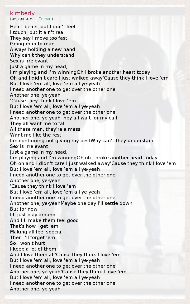Heart beats, but I don't feel I touch, but it ain't real They say I move too fast Going man to man Always holding a new hand Why can't they understand Sex is irrelevant Just a game in my head, I'm playing and I'm winningOh I broke another heart today Oh and I didn't care I just walked away'Cause they think I love 'em But I love 'em all, love 'em all ye-yeah I need another one to get over the other one Another one, ye-yeah 'Cause they think I love 'em But I love 'em all, love 'em all ye-yeah I need another one to get over the other one Another one, ye-yeahThey all wait for my call They all want me to fall All these men, they're a mess Want me like the rest I'm continuing not giving my bestWhy can't they understand Sex is irrelevant Just a game in my head, I'm playing and I'm winningOh oh I broke another heart today Oh oh and I didn't care I just walked away'Cause they think I love 'em But I love 'em all, love 'em all ye-yeah I need another one to get over the other one Another one, ye-yeah 'Cause they think I love 'em But I love 'em all, love 'em all ye-yeah I need another one to get over the other one Another one, ye-yeahMaybe one day I'll settle down But for now I'll just play around And I'll make them feel good That's how I get 'em Making all feel special Then I'll forget 'em So I won't hurt I keep a lot of them And I love them all'Cause they think I love 'em But I love 'em all, love 'em all ye-yeah I need another one to get over the other one Another one, ye-yeah'Cause they think I love 'em But I love 'em all, love 'em all ye-yeah I need another one to get over the other one Another one, ye-yeah